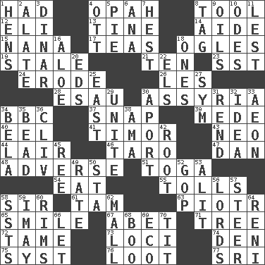 ACROSS 1. Possessed 4. Brightly colored fish 8. Implement 12. Biblical high priest 13. Prong on a fork 14. Assistant 15. Nanny 17. Afternoon social gatherings 18. Stares at amorously 19. Showing deterioration from age 21. "___ Little Indians" 23. Fast jet (abbr.) 24. Wear away 26. French article 28. Son of Isaac 30. Nineveh was its capital 34. English channel? 37. Fastener 39. Ancient Persian 40. Snakelike fish 41. Southeast Indonesia island 43. Modern: prefix 44. Den 46. Pacific island yam 47. Daniel's nick name 48. Contrary to your interests or welfare 51. Ancient Roman robe 54. Ingest 55. For Whom the Bell _____ 58. Title for a knight 61. Scottish cap 63. Peter (Polish) 65. Grin 67. Collude with 71. Relationship diagram 72. Docile 73. Venues 74. Lair 75. System (abbr.) 76. Spoils 77. _ Lanka DOWN 1. Coop moms 2. Having winglike extensions 3. Middle Eastern gold or silver currency 4. Baseball player Mel 5. Sliced dessert 6. Santa ___, CA 7. Command 8. Label 9. Petroleums 10. Lyric poems 11. For fear that 16. Medicinal plant 18. Washington bills 20. Begley and Asner 22. Raised railways 25. Compass direction 27. Symbol (abbr.) 29. Join together 30. To the left, to Queeg 31. Tear apart 32. It may be bright or harebrained 33. A really long time 34. Actor Lugosi 35. Necklace unit 36. 154 in Roman numerals 38. Wet nurse (var.) 42. Carrot, for example 45. To riddle 49. Assign a rank or rating to 50. R.R. building 52. Grand Old Party 53. Came down and settled, as after flight 56. Titled peers of a realm 57. Bull 58. Fast planes 59. "If ____ say so..." 60. Basketball hoops 62. Promenade 64. Painter Guido (1575-1642) 66. Allow 68. Oct. 31 cry 69. Environmental prefix 70. Teat (slang)