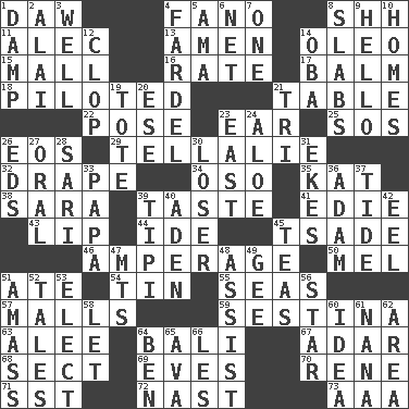 ACROSS 1. Fool 4. Papal veil 8. Quiet! 11. Actor Baldwin 13. So be it 14. Margarine 15. Shopping center 16. Pace 17. Lip ointment 18. Manned the helm 21. Eating place 22. Introduce or present, as a question 23. Ewer handle 25. Distress signal 26. Greek goddess of the dawn 29. Copy Pinocchio 32. Window treatment 34. Bear (Spanish) 35. Krazy ___ of comics 38. "Two Mules for Sister ____" 39. Clothes sense 41. Singer Brickell 43. Mouth edge 44. Binary compound 45. Sadhe (variant) 46. Electrical Measurement 50. Cartoonist voice _ Blanc 51. Had dinner 54. Shallow baking pan 55. Oceans 57. Promenades 59. French poetic form 63. Toward shelter 64. Indonesian resort city 67. The sixth month of the Jewish calendar 68. Religious group 69. Nights before holidays 70. French philosopher Descartes 71. Fast jet (abbr.) 72. Political cartoonist Thomas 73. American Automobile Association (abbr.) DOWN 1. Moist 2. Jai _ 3. Not ill 4. Burden 5. Nursemaid (var.) 6. Fish or hair follower 7. Single 8. Broad, flat, thick pieces 9. Phone greeting 10. Dwellings 12. Hoof sound 14. Chief or king in Benin or Nigeria 19. Haul 20. Compass dir. 21. Three (prefix) 23. Compass direction 24. _ vera 26. Begley and Asner 27. Of the mouth 28. Indian skirt 30. Failure 31. Makes supply last 33. Dad 36. First of billions? 37. Periodic rise and fall of the sea level 39. Native american tent (variation) 40. Arabian gulf 42. Snakelike fish 45. Beverages made from leaves 47. Mountains (abbr.) 48. Aid 49. Turn to the right 51. Collect or gather 52. Falsehoods 53. Voters do this 56. Play the lead 58. Allow 60. The main thing one is thinking about 61. Nanny 62. Type of rug 64. Benjamin's nick name 65. Actress Gardner 66. French article