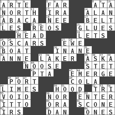 ACROSS 1. Johnson of "Laugh-In" 5. At a great distance 8. "One Day ___ Time" 11. _ pole 13. Lyricist Gershwin 14. Actor Alda or Thicke 15. Phillipine bananalike plant 16. Born 17. Waist strap 18. French article 19. Vintage cars 21. Cements 22. Froth on beer 24. Allows 25. Motion picture awards 27. She-sheep 29. Water vessel 30. Empty; void 32. Queen of England 1702-14 33. Member of a famous L.A. basketball team 35. "____ silly question..." 39. Trap for birds or small mammals 41. Proofreading order 42. Parent Teacher Association (abbr.) 43. Develop 45. Sweet dark-red dessert wine 48. Root beer relative 49. Citrus fruits 50. Parka part 52. Three (prefix) 55. Empty area or space 56. Not either 57. Keyboard key 59. "Tell ____ the Marines!" 60. Mouth or opening 61. Biscuitlike quick bread 62. Big collection agency 63. One of the 12 tribes of Israel 64. Singles DOWN 1. Of or related to the anus 2. Loose flowing garment 3. File 13 4. And so on (abbr.) 5. Fine (Spanish) 6. Ancient Greek god of war 7. Actress Charlotte 8. Eskimo relative 9. Stories 10. Pismires 12. Ethiopian city, capital of Harari 14. Competent 20. Begley and Asner 21. Small, secluded valley 23. Eroded 25. Chief or king in Benin or Nigeria 26. Male offspring 27. Compass dir. 28. Armed conflict 30. D.D.E's nickname 31. Artist's stand 33. Car dealer's back yard 34. White ___ sheet 36. Ski resort town in Vermont 37. Cask 38. Had dinner 40. Elects 43. Environmental prefix 44. Methods 45. Peter (Polish) 46. Leaves out 47. Do over again 49. 57 in ancient Rome 50. Israeli folk dance 51. Northwest Algerian city 53. French philosopher Descartes 54. Angers 56. Lower and raise head in agreement 58. Non-commissioned officer (abbr.)