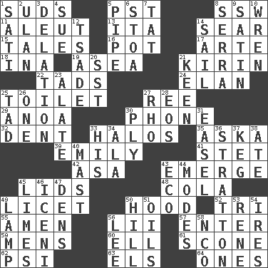 ACROSS 1. Soap bubbles 5. Pacific Standard Time (abbr.) 8. Compass dir. 11. Native American of Southwest Alaska 13. Call ___ day 14. Dry up 15. Lies 16. Cooking vessel 17. Johnson of "Laugh-In" 18. _ tizzy (2 wds.) 19. At sea 21. Japanese brewing company 22. Bits 24. Flair 25. Bathroom 27. Portuguese money of account (variant) 29. Small Philippine buffalo 30. Give a jingle 32. Undesirable depression on a surface 33. Radiant circles of light 35. "____ silly question..." 39. Poet Dickinson 41. Proofreading order 42. White ___ sheet 43. Develop 45. Flaplike coverings 48. Root beer relative 49. It is permitted: Lat. 50. Parka part 52. Three (prefix) 55. So be it 56. Cards in a Roman deck? 57. Keyboard key 59. Not women's 60. Pipe bend 61. Biscuitlike quick bread 62. 23rd letter of the Greek alphabet 63. Raised railways 64. Singles DOWN 1. Suttee (variant) 2. ____ Bator 3. Conveyance 4. Take to court 5. Corncob 6. Portico 7. Make lace 8. Father Junipero _ 9. Smooth fabric 10. Songbird 12. Sadhe (variant) 14. Travel by water 20. Fast jet (abbr.) 21. Peachy ____! 23. Having winglike extensions 25. Small boy 26. Single 27. 17th letter of the Greek alphabet 28. Greek goddess of the dawn 30. Apply oneself diligently 31. Artist's stand 33. Part of HMS, perhaps 34. Wing 36. Ski resort town in Vermont 37. Cask 38. Had dinner 40. Vertical spar for supporting sails 43. Environmental prefix 44. Methods 45. Citrus fruits 46. Ancient Celtic tribe of eastern Britain 47. Habitations of wild animals 49. Desk light 50. Land elevation 51. Petroleums 53. French philosopher Descartes 54. Angers 56. Area sheltered from the wind 58. Non-commissioned officer (abbr.)