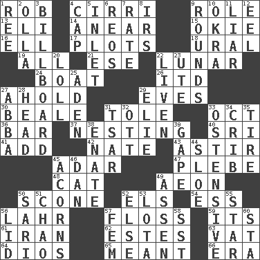 ACROSS 1. Director Reiner 4. High-altitude cloud 9. Hero or heavy, e.g. 13. Biblical high priest 14. Approach 15. Migrant worker of the '30s 16. Pipe bend 17. Ground plans 18. Mountain range 19. 100% 21. Compass dir. 22. Type of eclipse 24. Water vessel 26. It would 27. Hold, grip (Informal) 29. Nights before holidays 30. Memphis, Tenn. Street 31. Lacquered or enameled metalware 33. Sep. follower 36. Oblong piece of solid material 37. Snuggling 40. _ Lanka 41. Find the sum of 42. Nathan's nickname 43. Moving about 45. The sixth month of the Jewish calendar 47. Cadet 48. Feline 49. A really long time 50. Biscuitlike quick bread 52. Raised railways 54. Double-curved letter 56. Cowardly lion portrayer 57. Soft thread for cleaning between teeth 59. ___ a Wonderful Life 61. SW Asia republic 62. _____ Park, CO 63. Large container 64. "Vaya con ____" 65. Intended 66. Period DOWN 1. To separate or throw off 2. Spanish pot 3. Big road sign 4. Head covering 5. An arm off of a larger body of water 6. Vintage cars 7. Pace 8. Big collection agency 9. Periods in a boxing match 10. Gumbo ingredient 11. One who doesn't tell the truth 12. Snakelike fish 20. Hang loosely or laxly 22. Make or become more lively 23. Shoshoni 25. Arabian gulf 27. Swedish rock group 28. Froth on beer 29. Writer Wiesel 31. Russian ruler of old 32. Baseball player Mel 33. Clearly or manifestly demonstrative 34. Baby bed with high sides 35. Become fatigued 38. Maternal 39. Open wide 44. _ gin 45. Oak nuts 46. One of the 12 tribes of Israel 49. NE Netherlands city 50. Indian skirt 51. US Secretary of Labor Elaine L. _ 52. Otherwise 53. Globular water bottle used in Asia 55. Play the lead 56. Flaplike covering 57. Opposite of masc. 58. Fast jet (abbr.) 60. R.R. building