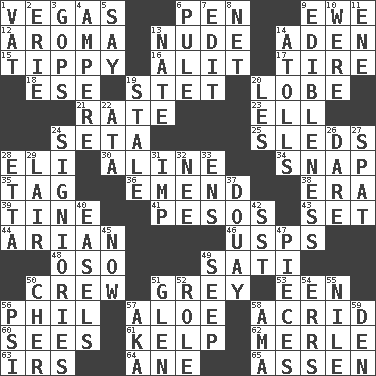 ACROSS 1. Viva Las _ 6. Fenced enclosure 9. She-sheep 12. Odor 13. Unadorned 14. Arabian gulf 15. Likely to tip or tilt 16. Came down and settled, as after flight 17. Become fatigued 18. Compass dir. 19. Proofreading order 20. Ear part 21. Assign a rank or rating to 23. Pipe bend 24. Stalk of a moss capsule 25. Bobsleighs 28. Connecticut Ivy Leaguer 30. Place in a line 34. Fastener 35. Label 36. Make improvements or corrections to 38. Period 39. Prong on a fork 41. Mexican monetary units 43. Arrange properly for use 44. Believer in; advocate of (suffix) 46. United States Postal Service (abbr.) 48. Bear (Spanish) 49. Suttee (variant) 50. Group working together 51. Jennifer or Joel 53. Car or cant ending 56. Silvers or Donahue 57. _ vera 58. Sour-tasting 60. Perceives with the eye 61. Seaweed 62. Haggard of country music 63. Big collection agency 64. A saturated hydrocarbon 65. NE Netherlands city DOWN 1. Large container 2. 4th largest of the Great Lakes 3. Republicans 4. Electrical Unit 5. Declare 6. Whine 7. Prepare for publication 8. Remaining after all deductions 9. The property of being fit to eat 10. We are 11. Compass dir. 13. Nathan's nickname 14. Ringlike coral islands and reefs 19. Showing deterioration from age 20. French article 22. _ moment's notice (2 wds.) 24. Seigniories (variant) 26. Have the gumption 27. Petty quarrel 28. Singer James 29. Den 31. Mischievous child 32. Born 33. Followers of ems 37. A city in N France, SE of Calais 40. Artist's stands 42. Fast jet (abbr.) 45. At this time 47. Parts 49. Ooze 50. "Mermaids" star 51. Small, secluded valley 52. Hero or heavy, e.g. 54. Blunders 55. "Death on the ____" 56. Air pressure measure (abbr.) 57. Alias (abbr.) 58. Nursemaid (var.) 59. Lair