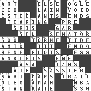 ACROSS 1. Tate display 4. Otherwise 8. Stare 12. Corporate head (abbr.) 13. (Had) reclined 14. State of nonexistence 15. First name in cosmetics 18. Pismires 19. Extremities 20. Rending 22. Before (prefix) 23. Indian titles of respect 24. Slender fish 25. Elected rep. 26. Elected representative 30. "Barney Miller" actor Jack 33. Singer Mel 36. Event that recurs at intervals 37. Among 39. One more than two 40. Inside; within (prefix) 41. French philosopher Descartes 42. Graphs 44. Double-curved letter 45. Short socks 47. Compass dir. 50. White ___ sheet 51. Scottish caps 53. Had dinner 54. More impudent 57. Indian skirt 59. Atlas contents 61. Distinguishing feature 63. Margarine 64. Nursemaid 65. Basketball assoc. 66. Comedian Laurel of Laurel & Hardy 67. Assign a rank or rating to 68. Compass dir. DOWN 1. Adept person 2. Repose 3. Hauls 4. Style 5. Austrian-born American filmmaker Fritz 6. Be seated 7. Followers of ems 8. Make much ado about nothing 9. Went 10. Hat (slang) 11. Begley and Asner 16. Hearing organs 17. One of the Great Lakes 21. Is not 22. Baking dish 24. Turn to the right 26. Stricken, poetically 27. Prong on a fork 28. Likelihood 29. Vintage cars 30. "Two Mules for Sister ____" 31. Sign of things to come 32. Pig sound 34. Lubricates 35. _ de Janeiro 38. Accusation by an informer 42. Parent Teacher Assoc. 43. Puts into a specified state 46. Compass dir. 48. Political cartoonist Thomas 49. Independent ruler or chieftain 52. Seines 53. Type of rug 54. Petty quarrel 55. American tennis player Robert 56. Teases 57. Mayday 58. The first octave above the treble staff 59. Third mo. 60. Nursemaid (var.) 62. The 23rd letter of the Hebrew alphabet