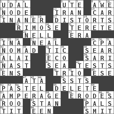 ACROSS 1. Allodial 5. Shoshoni 8. Deep reverence 11. Connecting point 12. SW Asia republic 13. Automobile 14. More lacking in sense or substance 17. What propaganda does 19. Full of chinks, cracks, or crevices 21. Cigar-shaped 22. 1994 drama film starring Jodie Foster 23. Epoch 24. _ tizzy (2 wds.) 27. Actress Patricia 29. Accounting whiz (abbr.) 32. Wanderer 34. Nervous spasm 36. Burn superficially 37. Mountain range southwest of Kyrgyzstan 38. Environmental prefix 39. Indian skirt 40. Political cartoonist Thomas 41. Ocean 42. Trials 43. Followers of ems 44. Musical group of three 46. Compass dir. 47. "One Day ___ Time" 50. Fast planes 52. Soft color 55. Keyboard key 57. Electrical Measurement 59. Eats (away) 62. Friend of Pooh 63. Comedian Laurel of Laurel & Hardy 64. Friends 65. Teat (slang) 66. Car or cant ending 67. Stricken, poetically DOWN 1. Single; one (prefix) 2. Spanish title 3. The sixth month of the Jewish calendar 4. Soviet premier 1918-24 5. RI univ. 6. Clothes sense 7. Keyboard key 8. Measure of real estate 9. Electrical Unit 10. Celtic language 12. Binary compound 15. Make improvements or corrections to 16. Hero or heavy, e.g. 18. Mouth or opening 20. Chalkboards 24. Lacking in sense or substance 25. Pitcher Ryan 26. Collect or gather 28. It is permitted: Lat. 29. Desist 30. Pieces 31. Get up 33. Small island 35. Unrefined 36. Compass dir. 42. Carrier 45. Small island 47. Had dinner 48. Laconic 49. Having winglike extensions 51. Closes up, plugs up 52. Component 53. Mine, in Marseilles 54. Specific locale 55. Lair 56. Dutch treat 58. Separate the seeds from cotton 60. Connecticut Ivy Leaguer 61. Fast jet (abbr.)