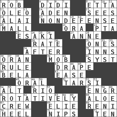 ACROSS 1. Director Reiner 4. "You Light Up My Life" star Conn 8. Singer James 12. Margarine 14. Arabian gulf 15. Perceives with the eye 16. Mountain range southwest of Kyrgyzstan 17. Unrelated to defense, as in spending 20. Shopping center 21. Mouth or opening 22. Parent Teacher Assoc. 23. 1973 Nobel Price Winner (Physics) Leo 27. Singer Murray 29. Assign a rank or rating to 31. Singles 34. Following 35. Restaurants 36. NW Algerian seaport 39. Disorderly crowd 41. System (abbr.) 42. Governing power 43. Window treatment 46. Actor Lugosi 47. Relaxation 48. Taken by mouth 51. Tarsus (plural) 54. Keyboard modifier key 56. _ de Janeiro 58. Engineer (abbr.) 61. Happening in regular succession 66. _ vera 67. Ship's personnel 68. Writer Wiesel 69. Painter Guido (1575-1642) 70. Person who is morally reprehensible 71. Cuts off 72. "___ Little Indians" DOWN 1. Wander aimlessly 2. Water jar 3. Calif. Air Force Base 4. One of the 12 tribes of Israel 5. Wedding promise 6. Lair 7. _ china 8. Compass dir. 9. 3-inch nail 10. Trial 11. At sea 13. Lubricates 18. Period 19. Avid follower 24. Sandy's bark 25. Krazy ___ of comics 26. Detail 28. Annoying sound 30. Eat (away) 32. Followers of ems 33. Fast jet (abbr.) 34. Approach 36. Globe 37. Sorrow 38. One to whom something is allotted 40. Naughty child 44. White ___ sheet 45. For each 49. Tate display 50. Cards in a Roman deck? 52. Dry up 53. An arm off of a larger body of water 54. Bowlike part 55. Old wives' tales, e.g. 57. Baking chamber 59. Went 60. It's straight from the horse's mouth 62. Leather borer 63. Biblical high priest 64. Mouth edge 65. Consenting reply