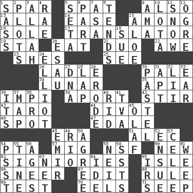 ACROSS 1. Practice fight 5. Petty quarrel 9. In addition 13. Silent film actress Nazimova 14. Relaxation 15. Amid 16. Flatfish 17. Interpreter 19. R.R. building 20. Erode 21. Superhero pair 22. Deep reverence 23. "______ My Girl" (Turtles hit) 25. Perceive with the eye 26. Dipping utensil 30. Light colored 34. Type of eclipse 35. Capital of Western Samoa 36. Body of Kaffir warriors 39. To the left, to Queeg 42. Move through with a circular motion 43. Pacific island yam 44. A piece of turf (Scot.) 46. Blemish 47. Peak District village in England 48. Epoch 51. Actor Baldwin 54. Parent Teacher Assoc. 57. Russian fighter aircraft 58. Science/research agcy. 60. ___ Haven, CT 62. Seigniories (variant) 65. Capri or Wight 66. Contemptuous expression 67. Prepare for publication 68. Court order 69. Trial 70. Snakelike fish 71. Ooze DOWN 1. Backtalk 2. Ground plans 3. Assad's deity 4. Actress Charlotte 5. Bristle 6. Component 7. White ___ sheet 8. Looks after 9. Housemaid (var.) 10. Globular water bottle used in Asia 11. Frozen precipitation 12. Legendary monster 15. _ vera 18. Take to court 20. He sold his birthright 24. American author Paul (1891-1958) 27. Heredity factor (abbr.) 28. Pet locale 29. Eat (away) 30. Soft color 31. Fitting 32. Cards in a Roman deck? 33. Hearing organ 36. ___ a Wonderful Life 37. Atlas unit 38. Adept person 40. To free from 41. Federal power corp. 45. Norwegian king 48. Arab leader 49. River (Sp.) 50. Match 52. Follow as a consequence or result 53. Cell (Danish) 54. Inconspicuous attention getter 55. Prong on a fork 56. Grows older 58. Famous astronaut Armstrong 59. Fast planes 61. Shed a tear 63. Remaining after all deductions 64. Binary compound 65. Big collection agency