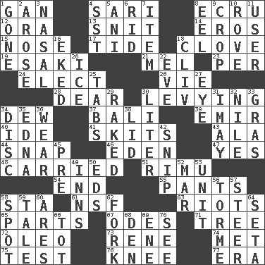 ACROSS 1. Separate the seeds from cotton 4. Indian skirt 8. Shade of tan 12. Mouth or opening 13. In a ____ (agitated or irritated) 14. Greek god of love 15. Olfactory organ 17. Event that recurs at intervals 18. Garlic unit 19. 1973 Nobel Price Winner (Physics) Leo 21. Cartoonist voice _ Blanc 23. For each 24. Opt 26. Compete 28. Letter starter 30. Imposing or collecting, as a tax 34. Morning condensation 37. Indonesian resort city 39. Independent ruler or chieftain 40. Binary compound 41. Burlesque acts 43. Wing 44. Fastener 46. Genesis locale 47. It is so 48. Borne 51. Tall New Zealand timber tree 54. Conclusion 55. Leg coverings 58. R.R. building 61. Overdraft (abbr.) 63. Disturbances 65. Components 67. Lyric poems 71. Family _ (genealogy) 72. Butter sub 73. French philosopher Descartes 74. Was introduced to 75. Trial 76. Leg joint 77. Period DOWN 1. Went 2. Came up 3. Relating to the nose 4. Fast jet (abbr.) 5. Black tropical American cuckoo 6. To free from 7. Detail 8. Snakelike fish 9. Riding implement 10. Be footloose 11. One who makes use of a thing 16. Supplemented with great effort 18. 154 in Roman numerals 20. Frozen water 22. Night before a holiday 25. Bar bills 27. Sight organ 29. Moved through 30. 61 cubic inches 31. "If ____ say so..." 32. The longest river in the world 33. Pate de foie ____ 34. Plate 35. Pulitzer Prize-winning author Ferber 36. Put on (as clothing) 38. Flaplike covering 42. Clip 45. Before (prefix) 49. Lodging establishments 50. Begley and Asner 52. Impair 53. A single undivided whole 56. Singer Mel 57. Bull 58. Blemish 59. Falsehood 60. Ancient Greek god of war 62. Tined utensil 64. Stalk of a moss capsule 66. Small child 68. Lair 69. Compass dir. 70. Perceive with the eye
