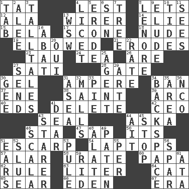 ACROSS 1. Make lace 4. For fear that 8. Allows 12. Chicken ___ king 13. One who wires 14. Writer Wiesel 15. Actor Lugosi 17. Biscuitlike quick bread 18. Unadorned 19. Turned at an angle; bent 21. Eats (away) 23. The 19th letter of the Greek alphabet 24. Beverage made from leaves 26. "We ___ not amused" (Victoria) 27. Suttee (variant) 28. Yard entry 30. Set 31. Electrical Unit 34. Prohibit 37. Compass dir. 38. Virtuous person 39. Curve 40. Begley and Asner 41. Keyboard key 42. Corporate head (abbr.) 43. Lick closed 44. "____ silly question..." 46. R.R. building 47. Plant excrement 50. It is 51. Fortification 54. Portable computers 57. Having or resembling wings 58. A salt of uric acid 60. Dad 62. Court order 63. 61 cubic inches 64. Domesticated feline 65. Singe 66. Paradise 67. Period DOWN 1. Bar bill 2. Toward shelter 3. Baron Munchausen's specialties 4. It is permitted: Lat. 5. Eat (away) 6. Elected rep. 7. Family _ (genealogy) 8. Poe poem 9. Dodge 10. Event that recurs at intervals 11. Observes 13. Compass dir. 16. Blind as ____ 20. Fr. "Yes" 22. Assign a rank or rating to 25. Rep 27. Transmit 29. Johnson of "Laugh-In" 30. Turn to the right 31. Toward the sea 32. Shopping centers 33. Sliced dessert 34. Keyboard key 35. Length times width 36. Non-commissioned officer (abbr.) 41. Letter starter 43. A viewer who gazes fixedly 44. Small island 45. Halt 46. Any of the three canals of the cochlea 48. Having winglike extensions 49. Eucharist need 51. Hearing organs 52. Turn sharply 53. Whimper 55. For each 56. Coast Guard woman 59. To free from 61. "One Day ___ Time"