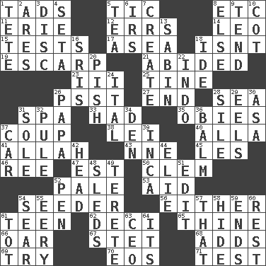 ACROSS 1. Bits 5. Nervous spasm 8. And so on (abbr.) 11. One of the Great Lakes 12. Blunders 14. Lion 15. Trials 17. At sea 18. Is not 19. Fortification 21. Stayed 23. One more than two 25. Prong on a fork 26. Inconspicuous attention getter 27. Conclude 28. Ocean 31. Health resort 33. Possessed 35. Off-Broadway awards 37. Clever action or accomplishment 38. Luau accessory 40. Silent film actress Nazimova 41. Assad's deity 43. Compass dir. 45. French article 46. To riddle 47. Eastern Standard Time (abbr.) 50. Clement's nick name 52. Light colored 53. Assist 54. Sowing specialist 56. One or the other 61. Adolescent 62. Tenth: prefix 65. One or ones belonging to thee 66. Boat paddle 67. Proofreading order 68. Does sums 69. Attempt to accomplish something 70. Greek goddess of the dawn 71. Trial DOWN 1. False hair 2. Ancient Greek god of war 3. Flat circle 4. Stalk of a moss capsule 5. Beverage made from leaves 6. Big collection agency 7. Make 8. Otherwise 9. Look after 10. Small bed 13. Unit of acoustic absorption 16. Indian titles of respect 18. Binary compound 20. Expression of disdain 22. _ china 24. Slanted text style (abbr.) 26. Dad 28. Filth; sediment 29. Snakelike fish 30. White ___ sheet 31. Flatfish 32. Whimper 34. Lair 36. Lip ointment 37. 4-wheeled motor vehicle 39. South American Indian 42. Froth on beer 44. Writer Wiesel 48. Bobsleighs 49. Cylindrical with tapered ends 51. Prepare for publication 52. Animal enclosure 54. Scorch 55. Suggestive of the supernatural 57. Not this but _ 58. Flintstone garb 59. Extremities 60. Take ten 61. Small child 63. Corporate head (abbr.) 64. ___ a Wonderful Life