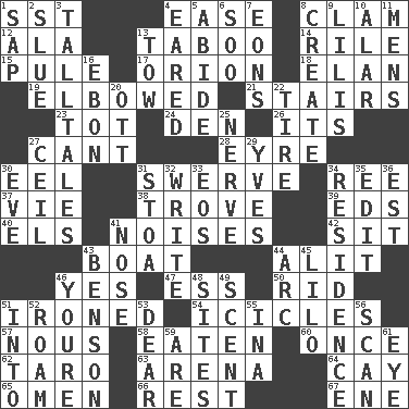 ACROSS 1. Fast jet (abbr.) 4. Relaxation 8. Dollar (slang) 12. Wing 13. Off limits 14. Cause heat under the collar 15. Whine 17. Greek mythologigal hunter 18. Liveliness 19. Turned at an angle; bent 21. Flight of steps 23. Small child 24. Lair 26. ___ a Wonderful Life 27. Patter 28. Jane of fiction 30. Snakelike fish 31. Turn aside suddenly 34. To separate or throw off 37. Compete 38. Collection of objects 39. Begley and Asner 40. Raised railways 41. Annoying sounds 42. Be seated 43. Water vessel 44. Set down 46. Consenting reply 47. Double-curved letter 50. To free from 51. Pressed 54. Winter's stalactites 57. Horse sense 58. Consumed 60. At one time in the past 62. Pacific island yam 63. Sports stadium 64. Island 65. Sign of things to come 66. Relief 67. Compass dir. DOWN 1. Plant excrement 2. Turn sharply 3. Baron Munchausen's specialties 4. Having ears or earlike features 5. Tolerate 6. "Barney Miller" actor Jack 7. Immeasurably long periods of time 8. Make 9. Ms. Damita and namesakes 10. Having or resembling wings 11. Not women's 13. Pull behind 16. Inky black, to poets 20. Baseball player Mel 22. Become fatigued 25. Impudent aggressiveness 27. To provide with a ceiling 29. Jacques Cousteau's middle name 30. First lady 31. Portico 32. Compose 33. Greek goddess of the dawn 34. Dwelling 35. Prepare for publication 36. Eastern Standard Time (abbr.) 41. Characteristic smell of wine 43. Gillaume's butler role 44. Curve 45. _ and Stitch 46. You are 48. Settings 49. Odor 51. To the inside or interior of 52. Wander aimlessly 53. Letter starter 55. _ tizzy (2 wds.) 56. Examine hastily 59. "We ___ not amused" (Victoria) 61. Sight organ