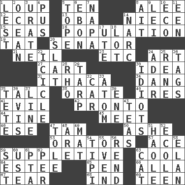 ACROSS 1. Central Nebraska county 5. Nine, plus one 8. Toward shelter 12. Shade of tan 13. Chief or king in Benin or Nigeria 14. Sibling's daughter 15. Oceans 16. Census information 19. Make lace 20. Legislator 21. Famous astronaut Armstrong 23. And so on (abbr.) 24. Tate display 27. Draw slowly or heavily 30. The content of cognition 31. New York city 34. Mild oath, euphamism for damn 35. Baby powder 38. Declaim 40. Angers 41. Tending to cause great harm 42. Right away 44. Prong on a fork 45. Confront 46. Compass dir. 47. Scottish cap 50. American tennis player Robert 53. Speakers 57. Adept person 59. Supplying deficiencies 63. Calm and collected 64. First name in cosmetics 65. Animal enclosure 66. Silent film actress Nazimova 67. Pull apart 68. Indiana (abbr.) 69. Adolescent DOWN 1. For fear that 2. Sea 3. A salt of uric acid 4. Product of festering 5. Drink excessively 6. Inky black, to poets 7. California wine valley 8. Small island 9. Flowery wreath 10. Environmental prefix 11. Car or cant ending 14. Drug cop 17. Shoshoni 18. Car dealer's back yard 20. Narrow board 22. Hanging ice 24. The sixth month of the Jewish calendar 25. French philosopher Descartes 26. Labels 28. 17th letter of the Greek alphabet 29. Canvas cover 30. Foolish or stupid persons 32. Auto 33. Smallest unit of an element 35. False hair 36. Deliberation 37. Actor's bit 39. Compass dir. 43. Beverages made from leaves 47. Lacquered or enameled metalware 48. "We ___ not amused" (Victoria) 49. Floor protector 51. White Person, in Hawaii 52. Learning spot: Fr. 54. Native american tent (variation) 55. Baking chamber 56. Tear apart 58. Style 59. Put into a specified state 60. Purpose 61. Parent Teacher Assoc. 62. For each 63. Domesticated feline