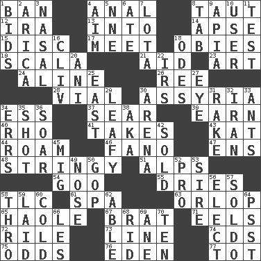 ACROSS 1. Prohibit 4. Of or related to the anus 8. Drawn tight 12. Retirement account (abbr.) 13. To the inside or interior of 14. Domed church section 15. Flat circle 17. Confront 18. Off-Broadway awards 19. Any of the three canals of the cochlea 21. Help 23. Tate display 24. Place in a line 26. To separate or throw off 28. Small bottle 30. Nineveh was its capital 34. Double-curved letter 37. Dry up 39. Merit 40. 17th letter of the Greek alphabet 41. Proceeds 43. Krazy ___ of comics 44. Wander 46. Papal veil 47. Followers of ems 48. Slender, wiry 51. High mountains 54. Thick or sticky substance 55. Frees from moisture 58. Affectionate concern, for short 61. Health resort 63. Fourth or lowest deck 65. White Person, in Hawaii 67. Naughty child 71. Snakelike fish 72. Cause heat under the collar 73. Actor's bit 74. Music discs 75. Likelihood 76. Genesis locale 77. Small child DOWN 1. Auction offers 2. N. Chile seaport 3. Rhinal 4. Direct toward a target or goal 5. Compass dir. 6. Had dinner 7. Globular water bottle used in Asia 8. Keyboard key 9. Capital of Western Samoa 10. One who makes use of a thing 11. Trial 16. 154 in Roman numerals 18. Lyric poems 20. Cuckoo 22. Big collection agency 25. Compass direction 27. Sight organ 29. Like summer trees 30. Sports stadium 31. Immoral or dissolute person 32. SW Asia republic 33. Pismires 34. Blunders 35. Guess 36. Fly high 38. Alias (abbr.) 42. Exchanged or delivered for money 45. Russian fighter aircraft 49. Sense of smell 50. Republican Party 52. Adept person 53. The founder of a family 56. Voters do this 57. Twentieth part of a lira 58. Through, poetically 59. Put down 60. Having a low temperature 62. Competent 64. Inconspicuous attention getter 66. French article 68. To free from 69. A saturated hydrocarbon 70. "___ Little Indians"