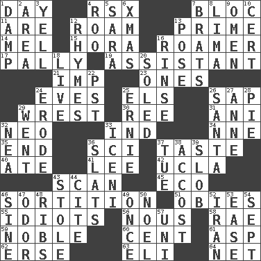 ACROSS 1. 24 hours 4. Acura sports coupe 7. Group of countries in special alliance 11. "We ___ not amused" (Victoria) 12. Wander aimlessly 13. A-one 14. Cartoonist voice _ Blanc 15. Israeli folk dance 16. Nomad 17. Chummy 19. Aide 21. Naughty child 23. Washington bills 24. Nights before holidays 25. Raised railways 26. Plant excrement 29. Obtain by seizing forcibly or violently 30. To sift 31. Cuckoo 32. Modern: prefix 33. Working for oneself (abbr.) 34. Compass dir. 35. Conclude 36. _-fi 37. Clothes sense 40. Had dinner 41. Area sheltered from the wind 42. Southern CA. univ. 43. Skim 45. Environmental prefix 46. Determination 51. Off-Broadway awards 55. Foolish or stupid persons 56. Good sense 58. Actress Charlotte 59. Having high moral qualities 60. Penny 61. Cleo's killer 62. Celtic language 63. Biblical high priest 64. Remaining after all deductions DOWN 1. Moist 2. Length times width 3. Shout 4. Friend of Pooh 5. "Two Mules for Sister ____" 6. Dec. holiday 7. Naughty children 8. Pale green bean 9. Presage 10. An absolute certainty 12. Poems 13. Introduce or present, as a question 16. Remove soap 18. Not recorded 20. Having a sole or soles 22. Pacific Standard Time (abbr.) 24. Eat (away) 25. Bert's buddy 26. Before Barbara or Clara 27. Queen of England 1702-14 28. Sliced dessert 29. Gone 32. Teachers' org. 33. Ancient Celtic tribe of eastern Britain 36. Narrow boards 37. Third day of the wk. 38. Buttonhole 39. Messy guy 43. Took without asking 44. Quote 46. Trig term 47. Scent 48. Chest bones 49. At one time in the past 50. Christmas carol 52. SW Asia republic 53. Relaxation 54. Back-to-school mo. 57. Corn or form start