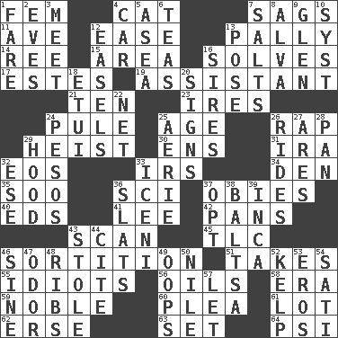 ACROSS 1. Opposite of masc. 4. Domesticated feline 7. Sinks 11. "___ Maria" 12. Relaxation 13. Friendly 14. To separate or throw off 15. Length times width 16. Finds the solution 17. _____ Park, CO 19. Aide 21. "___ Little Indians" 23. Angers 24. Whine 25. Grow older 26. Strike 29. Robbery 30. Followers of ems 31. Lyricist Gershwin 32. Greek goddess of the dawn 33. Big collection agency 34. Lair 35. "Barney Miller" actor Jack 36. _-fi 37. Off-Broadway awards 40. Begley and Asner 41. Area sheltered from the wind 42. Baking dishes 43. Examine hastily 45. Affectionate concern, for short 46. Decision 51. Proceeds 55. Foolish or stupid persons 56. Petroleums 58. Epoch 59. Having high moral qualities 60. Entreaty 61. Car dealer's back yard 62. Celtic language 63. Put into a specified state 64. 23rd letter of the Greek alphabet DOWN 1. Conductor's collection 2. Nights before holidays 3. Rendezvous 4. Auto 5. At sea 6. Beverages made from leaves 7. Table seasonings 8. Inventor's middle name 9. Small, secluded valley 10. System (abbr.) 12. Artist's stands 13. Introduce or present, as a question 16. Begets 18. Needle holder 20. Omens 22. Fish or hair follower 24. Mexican monetary units 25. Nest on high 26. Amusement-park features 27. Ancient Greek god of war 28. Baking dish 29. Parka part 32. Compass dir. 33. Ancient Celtic tribe of eastern Britain 36. Narrow boards 37. Elect 38. Greek mezzo-soprano Agnes 39. South American Indian 43. Took without asking 44. Quote 46. Trig term 47. Aroma 48. Chest bones 49. I made a mistake 50. Mediterranean tributary 52. Seaweed 53. Greek god of love 54. Suttee (variant) 57. Allow