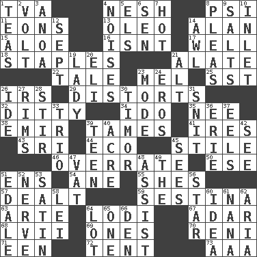 ACROSS 1. Federal power corp. 4. Tender 8. Air pressure measure (abbr.) 11. Immeasurably long periods of time 13. Butter sub 14. Actor Alda or Thicke 15. _ vera 16. Is not 17. Water source 18. Paper fasteners 21. Having winglike extensions 22. Story 23. Cartoonist voice _ Blanc 25. Fast jet (abbr.) 26. Big collection agency 29. What propaganda does 32. Short, simple song 34. Wedding promise 35. Born 38. Arab leader 39. Makes less strong or intense 41. Angers 43. _ Lanka 44. Environmental prefix 45. Vertical member of a panel or frame 46. Make much ado about nothing 50. Compass dir. 51. Followers of ems 54. One (Scot) 55. "______ My Girl" (Turtles hit) 57. Started a card game 59. French poetic form 63. Johnson of "Laugh-In" 64. Farming town in central California 67. The sixth month of the Jewish calendar 68. 57 in ancient Rome 69. Washington bills 70. Painter Guido (1575-1642) 71. Car or cant ending 72. Portable shelter 73. American Automobile Association (abbr.) DOWN 1. Afternoon social gatherings 2. Electrical Unit 3. Small Philippine buffalo 4. Annoying sounds 5. Raised railways 6. Elected rep. 7. Being at a high temperature 8. Entreaties 9. Table seasonings 10. An arm off of a larger body of water 12. Back-to-school mo. 14. Leather borer 19. Kenny Rogers chart-topper in '80 20. Biblical high priest 21. Keyboard modifier key 23. Method 24. Greek god of love 26. Binary compound 27. Basketball hoops 28. Commotion 30. Southeast Indonesia island 31. In a ____ (agitated or irritated) 33. Musical group of three 36. One of the Great Lakes 37. Snakelike fish 39. Adolescent 40. 43,560 square feet 42. Observe 45. Observes 47. Large container 48. Aid 49. Definite Article 51. Peak District village in England 52. Effrontery 53. Smooth fabric 56. Play the lead 58. Flowery wreath 60. The content of cognition 61. Grandmother 62. Roberta Peters solo 64. Car dealer's back yard 65. Single 66. Lair