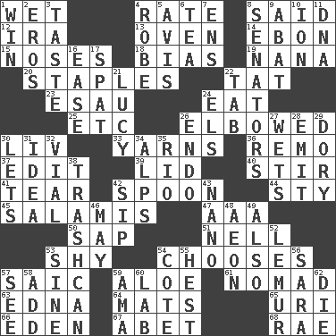 ACROSS 1. Dripping 4. Assign a rank or rating to 8. Expressed in words 12. Retirement account (abbr.) 13. Baking chamber 14. Inky black, to poets 15. Olfactory organs 18. Prejudice 19. Grandmother 20. Paper fasteners 22. Make lace 23. Son of Isaac 24. Consume 25. And so on (abbr.) 26. Turned at an angle; bent 30. 54 in ancient Rome 33. Entertaining tales 36. San ____ (Riviera town) 37. Prepare for publication 39. Hat (slang) 40. Commotion 41. Pull apart 42. Soup utensil 44. Filthy place 45. Deli grouping 47. American Automobile Association (abbr.) 50. Plant excrement 51. 1994 drama film starring Jodie Foster 53. Like a shrinking violet 54. Opts 57. Ketch in the Levant 59. Medicinal plant 61. Roamer 63. Pulitzer Prize-winning author Ferber 64. Floor protectors 65. RI univ. 66. Locale of original sin 67. Collude with 68. Actress Charlotte DOWN 1. Victory 2. Greek god of love 3. Clothes sense 4. Loose flowing garment 5. Opinion 6. Beverage made from leaves 7. Followers of ems 8. Elected representatives 9. Blind as ____ 10. Electrically charged atom 11. Heredity factor (abbr.) 16. Relaxation 17. Argument over a trivial matter 21. "I Love _" 22. Keyboard key 24. Raised railways 26. Inside; within (prefix) 27. Moistens 28. Give off 29. Rowboat 30. Allows 31. The content of cognition 32. Small bottle 34. High mountains 35. _ de Janeiro 38. File 13 42. Small drink 43. Billionth: prefix 46. Can I? 48. A really long time 49. In addition 52. Arboreal primate 53. Trig term 54. ____ d'Azur (French Riviera) 55. Command 56. "Two Mules for Sister ____" 57. Observe 58. Increase 59. Housemaid (var.) 60. Experiment locale 62. Expire