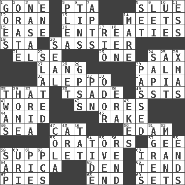 ACROSS 1. Went 5. Parent Teacher Association (abbr.) 8. Turn sharply 12. Northwest Algerian city 13. Mouth edge 14. Confronts 15. Comfort 16. Pleas 19. R.R. building 20. More lively and spirited 21. Otherwise 23. Single 24. Saxophone 27. Long (Scottish) 30. Inside of hand 31. City in Syria 34. Capital of Western Samoa 35. Not this but _ 38. Sadhe (variant) 40. Fast planes 41. Had on 42. Sounds asleep 44. Among 45. Immoral or dissolute person 46. Ocean 47. Feline 50. Dutch treat 53. Speakers 57. Turn to the right 59. Supplying deficiencies 63. SW Asia republic 64. N. Chile seaport 65. Lair 66. Watch over 67. Sliced desserts 68. Conclude 69. Arranges properly for use DOWN 1. Travels 2. Speak pompously 3. Relating to the nose 4. Compass dir. 5. Entreaty 6. Canisters 7. Flats, for short 8. Put into a specified state 9. Flowery wreath 10. Shoshoni 11. Double-curved letter 14. Female horse 17. _ de Janeiro 18. Car or cant ending 20. Lick closed 22. Scheduled 24. Plant excrements 25. Set down 26. Dec. holiday 28. Fish or hair follower 29. Global Positioning Systems (abbr.) 30. Went by 32. Baking dish 33. Aroma 35. It was, poetically 36. Dwelling 37. Roberta Peters solo 39. Epoch 43. Makes supply last 47. Root beer relative 48. "We ___ not amused" (Victoria) 49. Make lace 51. Match 52. Intended 54. Periodic rise and fall of the sea level 55. Baking chamber 56. Tear apart 58. Extremities 59. Plant excrement 60. RI univ. 61. Sliced dessert 62. Personal Computers (abbr.) 63. ___ a Wonderful Life