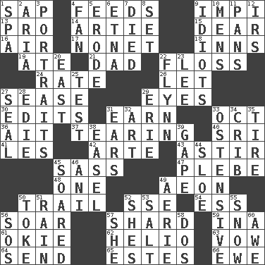 ACROSS 1. Plant excrement 4. Gives food to 9. Body of Kaffir warriors 13. Adept person 14. Nick name for Arthur 15. Letter starter 16. Wind 17. Music written for nine 18. Lodging establishments 19. Had dinner 21. June honoree 22. Soft thread for cleaning between teeth 24. Pace 26. Allow 27. Gospel singer Marvin 29. Snake ____ (dice throw) 30. Proofreads 31. Merit 33. Sep. follower 36. Small island 37. Pulling into pieces 40. _ Lanka 41. French article 42. Johnson of "Laugh-In" 43. Having gotten out of bed 45. Backtalk 47. Cadet 48. Single 49. A really long time 50. Get behind 52. Compass dir. 54. Double-curved letter 56. Fly high 57. Broken piece 59. _ tizzy (2 wds.) 61. Migrant worker of the '30s 62. Sun: prefix 63. Solemn pledge 64. Post 65. _____ Park, CO 66. She-sheep DOWN 1. Health resort 2. Operatic vocal solo 3. Likenesses of persons 4. Avid follower 5. Eat (away) 6. Inactive volcano in Sicily 7. Passed on 8. Put into a specified state 9. Foolish or stupid persons 10. Not women's 11. Zero-star reviews 12. Big collection agency 20. 90 degrees 22. Film actor Errol 23. Area sheltered from the wind 25. Trial 27. Lick closed 28. Singer Brickell 29. 4th largest of the Great Lakes 31. Hearing organs 32. Nonscientific branch of learning 33. Clearly or manifestly demonstrative 34. Baby bed with high sides 35. Hoop that covers a wheel 38. Artist's stand 39. Open wide 44. _ gin 45. Flew 46. Black tropical American cuckoo 49. Nest on high 50. Casino tip 51. Water falling in drops from the sky 52. "______ My Girl" (Turtles hit) 53. Table seasoning 55. Overwhelm 56. Distress signal 57. A female animal or person 58. Two (Sp.) 60. Deep reverence