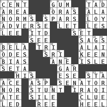 ACROSS 1. Penny 5. Chewing product 8. Small amount or degree 11. Length times width 12. Mouths or openings 14. According to 15. Typical standards 17. Practice fights 18. Myrna of the movies 19. Contrary to your interests or welfare 21. Allow 22. French article 23. Area sheltered from the wind 24. It would 25. Arrange properly for use 27. Perceive with the eye 28. Sinks 31. Actor Lugosi 35. Three (prefix) 37. Jai _ 38. Lyric poems 39. Indian title of respect (Mr.) 41. Peachy ____! 42. Prejudice 43. A saturated hydrocarbon 45. Capri or Wight 46. Stalk of a moss capsule 47. Slender fish 49. Part of HMS, perhaps 51. Compass dir. 52. R.R. building 55. Adept person 57. Viper 60. Elected representative 62. Not either 63. Difficult or unusual or dangerous feat 65. Resident of Iraq 66. Had dinner 67. Filth; sediment 68. A slight indication 69. Directed 70. To sift 71. Person who is morally reprehensible DOWN 1. Lessep's creation 2. Eat (away) 3. Boldness 4. Docile 5. Republican Party 6. Mountain range 7. Female horse 8. Baron Munchausen's specialties 9. _ vera 10. 24-hour periods 13. Fast planes 16. Indian titles of respect 17. Spring feasts 20. Proofreading order 26. 1973 Nobel Price Winner (Physics) Leo 29. Highlander 30. Trig term 31. Moves up and down 32. Singer Brickell 33. Resembling or made to resemble leather 34. Slender Brazilian palm 36. Lyricist Gershwin 40. Swallow 44. Comfort 48. Painter Guido (1575-1642) 50. Backtalk 52. Lacking originality or spontaneity 53. Woman's close-fitting hat 54. Satellite of Uranus 55. Of or related to the anus 56. ____ d'Azur (French Riviera) 58. Agitate 59. Whimper 61. Bowlike part 64. Born