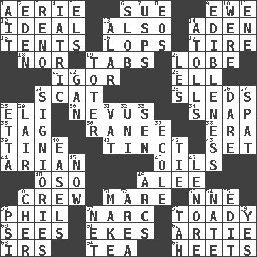 ACROSS 1. Nest on high 6. Institute legal proceedings 9. She-sheep 12. Standard of perfection 13. In addition 14. An important port of Yemen 15. Portable shelters 16. Chops off 17. Hoop that covers a wheel 18. Not either 19. Bar bills 20. Ear part 21. Russian composer Stravinsky 23. Pipe bend 24. Get outta here! 25. Bobsleighs 28. Connecticut Ivy Leaguer 30. Mole, birthmark 34. Fastener 35. Label 36. Indian princess (variant) 38. Period 39. Prong on a fork 41. Tinged 43. Put into a specified state 44. Believer in; advocate of (suffix) 46. Petroleums 48. Bear (Spanish) 49. Toward shelter 50. Group working together 51. Female horse 53. Compass dir. 56. Silvers or Donahue 57. Drug cop 58. Sycophant 60. Observes 61. Supplements with great effort 62. Nick name for Arthur 63. Big collection agency 64. Beverage made from leaves 65. Confronts DOWN 1. Small island 2. Locale of original sin 3. Western Nevada city 4. Of or pertaining to medicine 5. Raised railways 6. Oscar Madison type 7. United States Postal Service (abbr.) 8. Greek goddess of the dawn 9. The property of being fit to eat 10. Past tense of be (plural) 11. Compass dir. 13. Having or resembling wings 14. Ringlike coral islands and reefs 19. Carrier 20. French article 22. Separate the seeds from cotton 24. Seigniories (variant) 26. Have the gumption 27. Petty quarrel 28. Singer James 29. Den 31. Large container 32. Single; one (prefix) 33. Elected rep. 37. Learning spot: Fr. 40. Artist's stands 42. Make a knot 45. At this time 47. Poe poem 49. Arches 50. "Mermaids" star 51. Cause to be 52. Length times width 54. Nathan's nickname 55. Prepare for publication 56. Air pressure measure (abbr.) 57. Remaining after all deductions 58. Scottish cap 59. Affirmative reply