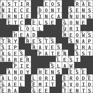 ACROSS 1. Moving about 6. Greek goddess of the dawn 9. Actress Charlotte 12. Sibling's daughter 13. Do not 14. Elected reps. 15. Bert's buddy 16. South American Indian 17. Religious women 18. And so on (abbr.) 19. Otherwise 20. Went 21. Hang loosely or laxly 23. RI univ. 24. Froth on beer 25. Catcalls? 28. Attempt to accomplish something 30. Musical pauses 34. Fastener 35. Small drink 36. All-night dance parties 38. Retirement account (abbr.) 39. Ripens 41. Eucharist need 43. Fast jet (abbr.) 44. More valued for its uncommonness 46. For fear that 48. Sliced dessert 49. Cole _ (cabbage dish) 50. "60 Minutes" Commentator Rooney 51. Coop moms 53. Compass dir. 56. Medicinal plant 57. Australian parrot (variant) 58. Wear away 60. Highlander 61. Give off 62. Shun 63. Epoch 64. Unit of force equal to gravity 65. Portable shelters DOWN 1. One (Scot) 2. Beget 3. Portable shelter 4. Ice on the eave 5. To separate or throw off 6. Immeasurably long periods of time 7. At one time in the past 8. R.R. building 9. One who advocates reunion 10. Queen of England 1702-14 11. Double-curved letter 13. Deli pickle 14. Sounds asleep 19. A person who is older than you are 20. Chewing product 22. Rowing implement 24. Abnormally rapid or deep breathing 26. Armed conflicts 27. Petty quarrel 28. Russian ruler of old 29. Port city in Latvia 31. Plant excrement 32. Federal power corp. 33. Arrange properly for use 37. Makes a sale 40. Beer mug 42. Teachers' org. 45. Marina Del _, California 47. Turn aside suddenly 49. In a ____ (agitated or irritated) 50. Having or resembling wings 51. Dwelling 52. One of the Great Lakes 54. Within a short period 55. Prepare for publication 56. Ripen 57. Part of a journey 58. Ingest 59. Begley and Asner