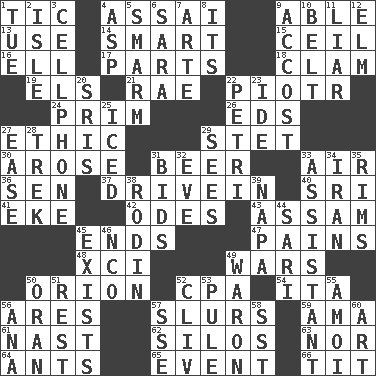ACROSS 1. Nervous spasm 4. Slender Brazilian palm 9. Competent 13. Purpose 14. Don Adams' spy role 15. To provide with a ceiling 16. Pipe bend 17. Actors' quests 18. Dollar (slang) 19. Raised railways 21. Actress Charlotte 22. Peter (Polish) 24. Demure 26. Begley and Asner 27. Principle of right and wrong 29. Proofreading order 30. Came up 31. Fermented drink made from hops 33. Atmosphere 36. Elected rep. 37. Popular '50s hangout 40. _ Lanka 41. Supplement with great effort 42. Lyric poems 43. Indian state 45. Extremities 47. Aches 48. One more than ninety 49. Armed conflicts 50. Greek mythologigal hunter 52. Numbers guy (abbr.) 54. Call ___ day 56. Ancient Greek god of war 57. Runs notes together 59. Housemaid (var.) 61. Political cartoonist Thomas 62. Grain storage towers 63. Not either 64. Pismires 65. Happening 66. Teat (slang) DOWN 1. Third day of the wk. 2. Capri or Wight 3. Portable communications device 4. Viper 5. Excessive but superficial compliments 6. "Two Mules for Sister ____" 7. Johnson of "Laugh-In" 8. ___ a Wonderful Life 9. Buttonhole 10. Waist strap 11. One who doesn't tell the truth 12. Shade tree 20. Indian titles of respect 22. _ dish (used to culture cells) 23. Binary compound 25. On the rocks 27. Comfort 28. Long journey 29. Observes 31. Auction offers 32. First lady 33. Aide 34. SW Asia republic 35. Basketball hoops 38. "The Thinker" sculptor 39. California wine valley 44. Indian skirt 45. Is 46. Non-commissioned officer (abbr.) 49. Make _____ (do battle with) 50. NW Algerian seaport 51. Relief 52. 154 in Roman numerals 53. Whimper 55. Mine, in Marseilles 56. Santa ___, CA 57. Compass dir. 58. Fast jet (abbr.) 60. Tate display