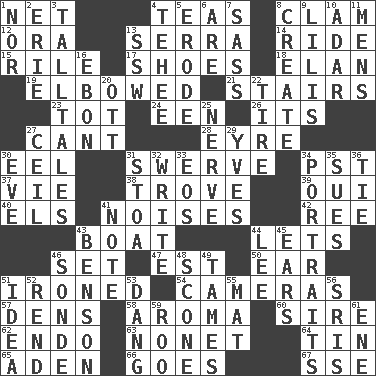 ACROSS 1. Remaining after all deductions 4. Beverages made from leaves 8. Burrowing marine mollusk 12. Mouth or opening 13. Father Junipero _ 14. Travel on or in a vehicle 15. Cause heat under the collar 17. Imelda's hoard 18. Style 19. Turned at an angle; bent 21. Flight of steps 23. Small child 24. Car or cant ending 26. It is 27. Patter 28. Jane of fiction 30. Snakelike fish 31. Turn aside suddenly 34. Pacific Standard Time (abbr.) 37. Compete 38. Collection of objects 39. Fr. "Yes" 40. Raised railways 41. Annoying sounds 42. To sift 43. Water vessel 44. Allows 46. Put into a specified state 47. Eastern Standard Time (abbr.) 50. Hearing organ 51. Pressed 54. Devices for capturing images 57. Habitations of wild animals 58. Odor 60. Male parent of an animal 62. Inside; within (prefix) 63. Music written for nine 64. Metal container 65. An important port of Yemen 66. Travels 67. Compass dir. DOWN 1. Not either 2. 4th largest of the Great Lakes 3. Baron Munchausen's specialties 4. Giggle 5. Eat (away) 6. "We ___ not amused" (Victoria) 7. Backtalk 8. Cause to be 9. Ms. Damita and namesakes 10. The sixth month of the Jewish calendar 11. Not women's 13. Compass dir. 16. Inky black, to poets 20. Baseball player Mel 22. Hoop that covers a wheel 25. Boldness 27. To provide with a ceiling 29. Jacques Cousteau's middle name 30. First lady 31. Portico 32. Compose 33. Greek goddess of the dawn 34. Likenesses of persons 35. Takes to court 36. Standoff 41. Short letter 43. Gillaume's butler role 44. Area sheltered from the wind 45. Hearing organs 46. Something which is sent 48. Biscuitlike quick bread 49. Softens 51. It may be bright or harebrained 52. Tear apart 53. Mild oath, euphamism for damn 55. Floor protector 56. Indian titles of respect 59. Friend of Pooh 61. Compass dir.