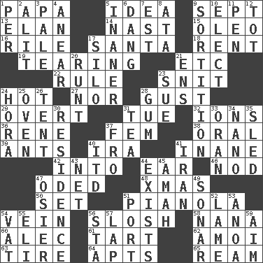 ACROSS 1. Dad 5. It may be bright or harebrained 9. Back-to-school mo. 13. Liveliness 14. Political cartoonist Thomas 15. Margarine 16. Cause heat under the collar 17. Before Barbara or Clara 18. Monthly bill 19. Lacerating 21. And so on (abbr.) 22. Court order 23. In a ____ (agitated or irritated) 24. Being at a high temperature 27. And not 28. Abrupt rush of wind 29. Unconcealed 31. Third day of the wk. 32. Charged atoms 36. French philosopher Descartes 37. Opposite of masc. 38. Of the mouth 39. Pismires 40. Retirement account (abbr.) 41. Lacking in sense or substance 42. To the inside or interior of 44. Ewer handle 46. Lower and raise head in agreement 47. Wrote a lyric poem 48. Dec. holiday 50. Arrange properly for use 51. Player piano 54. Distinctive style or manner 56. Splash clumsily 58. Nanny 60. Actor Baldwin 61. Small pie 62. Mine, in Marseilles 63. Hoop that covers a wheel 64. Tenement units (abbr.) 65. 480, 500 or 516 sheets of paper DOWN 1. For each 2. Came down and settled, as after flight 3. Diluted with white 4. Approach 5. More empty; more void 6. Mild oath, euphamism for damn 7. Eastern Standard Time (abbr.) 8. "One Day ___ Time" 9. Casting lots 10. Choose 11. Writing instrument 12. Small child 17. Grain storage tower 20. The smallest animal of a litter 21. Followers of ems 23. Take to court 24. Israeli folk dance 25. Baking chamber 26. Portable shelter 28. Chewing product 30. Home 31. Beverage made from leaves 33. NW Algerian seaport 34. Billionth: prefix 35. Downhill vehicle 37. Back 40. It would 41. SW Asia republic 43. Fish or hair follower 44. Is 45. Nursemaid 47. Flexible twig of a willow tree 49. Echolocation 51. Sweet dark-red dessert wine 52. Unable to walk 53. Small Philippine buffalo 54. Large container 55. Biblical high priest 56. R.R. building 57. Pet locale 59. Direct toward a target or goal