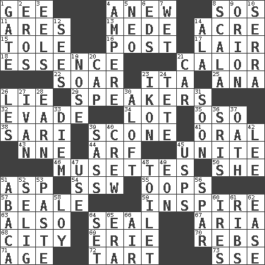 ACROSS 1. Unit of force equal to gravity 4. Afresh 8. Mayday 11. Ancient Greek god of war 13. Ancient Persian 14. 43,560 square feet 15. Lacquered or enameled metalware 16. Mail 17. Den 18. Center 21. Bodily heat indicating an inflammation 22. Fly high 23. Call ___ day 25. Santa ___, CA 26. Untruth 29. Orators 32. Dodge 34. Car dealer's back yard 35. Bear (Spanish) 38. Indian skirt 39. Biscuitlike quick bread 41. Taken by mouth 43. Compass dir. 44. Sandy's bark 45. Join together 46. French bagpipes 50. A female animal or person 51. Cleo's killer 54. Compass dir. 55. I made a mistake 57. Memphis, Tenn. Street 59. Motivate 63. In addition 64. Lick closed 67. Operatic vocal solo 68. Municipality 69. 4th largest of the Great Lakes 70. Confederate soldiers (slang) 71. Mature 72. Small pie 73. Compass dir. DOWN 1. Yard entry 2. Greek god of love 3. Snakelike fish 4. Electrical Unit 5. Modern: prefix 6. Begley and Asner 7. Soggy 8. Any of the three canals of the cochlea 9. Constellation of myth 10. Spanish missionary in California 12. Perceives with the eye 14. In the manner of 19. Olfactory organ 20. Head covering 21. Automobile 23. Picture 24. Wig 26. French article 27. _ the terrible 28. Merit 30. At or to great height 31. Within a short period 33. South Vietnam president (1954) 36. Indian titles of respect 37. Pledge 39. Backtalk 40. Group working together 42. Area sheltered from the wind 45. United States Postal Service (abbr.) 47. Purpose 48. Rest room 49. A really long time 51. Phillipine bananalike plant 52. Former Milwaukee Brewers owner Bud 53. Thick mixture 56. Practice fight 58. Myrna of the movies 60. Angers 61. Chest bones 62. Relaxation 64. Put into a specified state 65. Epoch 66. Atmosphere