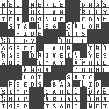 ACROSS 1. Cartoonist voice _ Blanc 4. Haggard of country music 9. Mouths or openings 13. Sight organ 14. Sea 15. Have trust in 16. Afternoon social gathering 17. Child's nurse 18. Dutch treat 19. R.R. building 21. Part of a journey 22. Bodily heat indicating an inflammation 24. Flintstone garb 26. It is 27. Morally degraded 29. Family _ (genealogy) 30. Match 31. Cowardly lion portrayer 33. Three (prefix) 36. Actress Charlotte 37. Popular '50s hangout 40. Consenting reply 41. Say or write further 42. "If ____ say so..." 43. Showery time 45. Small Philippine buffalo 47. Give a jingle 48. Car dealer's back yard 49. Ketch in the Levant 50. Gives food to 52. Sound made by sheep 54. Flaplike covering 56. Simple or foolish person 57. Monte _, Las Vegas Hotel/Casino 59. Color 61. Clip 62. Believer in; advocate of (suffix) 63. _ tizzy (2 wds.) 64. "Corrida" creature 65. Sadhe (variant) 66. Remaining after all deductions DOWN 1. Was introduced to 2. Snake ____ (dice throw) 3. Resembling or made to resemble leather 4. Crowd into 5. Learning spot: Fr. 6. French philosopher Descartes 7. Austrian-born American filmmaker Fritz 8. Compass dir. 9. Threatening words 10. Redecorate 11. Having or resembling wings 12. Symbol (abbr.) 20. Helper 22. High-altitude cloud 23. Had dinner 25. Colored 27. "Two Mules for Sister ____" 28. Mild oath 29. Those people 31. Pale green bean 32. Actress Gardner 33. Polypeptide antibiotic 34. It's straight from the horse's mouth 35. Capri or Wight 38. Debaucheries 39. California wine valley 44. Silvers or Donahue 45. City in Syria 46. Lower and raise head in agreement 49. First course 50. A pale, very dry sherry 51. Arab leader 52. Oblong pieces of solid material 53. Roberta Peters solo 55. Unit of force 56. Fast jet (abbr.) 57. Domesticated feline 58. Single 60. Ingest