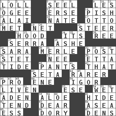 ACROSS 1. Hang loosely or laxly 5. Stitch closed the eyes of (a falcon) 9. French article 12. Double curve, resembling the letter S 13. Celtic language 14. Expression of disdain 15. Jai ____ 16. Nathan's nickname 17. "Beetle Bailey" pooch 18. Was introduced to 19. Remaining after all deductions 21. Bull 22. Parka part 24. It is 26. Portuguese money of account (variant) 27. Spanish missionary in California 28. American tennis player Robert 29. "Two Mules for Sister ____" 30. Haggard of country music 32. Mail 36. Proofreading order 37. Born 38. Singer James 39. Event that recurs at intervals 40. Leg coverings 42. Not this but _ 43. Stalk of a moss capsule 44. Less widely known 46. Adept person 49. Compass dir. 50. Russian composer Stravinsky 51. Make or become more lively 53. Compass dir. 54. Dripping 57. Arabian gulf 58. _ vera 61. Flintstone garb 62. Be inclined (to) 63. Letter starter 64. Toward the sea 65. Curvy letter 66. Dinghy 67. Hiding places for outlaws DOWN 1. Rich soil 2. Stare at amorously 3. Resembling or made to resemble leather 4. Luau accessory 5. Transmitted 6. Period 7. Eastern Standard Time (abbr.) 8. Area sheltered from the wind 9. 61 cubic inches 10. First name in cosmetics 11. Dinah or Pauly 14. Cooking vessel 19. And not 20. Dutch treat 21. Compass dir. 23. Declaim 24. Small island 25. Definite Article 27. Suttee (variant) 28. Sports stadium 29. Fast jet (abbr.) 31. Maternal 32. Stone: prefix 33. Else 34. Play the lead 35. Make lace 40. Writing instrument 41. Indian titles of respect 43. Elected rep. 45. Grow older 46. Food holder 47. Amusement-park features 48. Baking chambers 52. Conclusion 53. Suggestive of the supernatural 55. Genesis locale 56. Beverages made from leaves 58. Increase 59. Lion 60. Boat paddle 61. Possessed