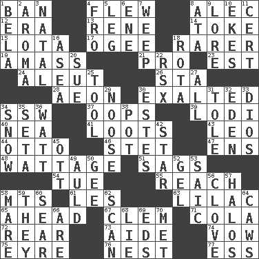 ACROSS 1. Bar 4. Soared 8. Actor Baldwin 12. Period 13. French philosopher Descartes 14. Casino tip 15. Globular water bottle used in Asia 17. Double curve, resembling the letter S 18. Less widely known 19. Collect or gather 21. Adept person 23. Eastern Standard Time (abbr.) 24. Eskimo relative 26. R.R. building 28. A really long time 30. Glorified 34. Compass dir. 37. I made a mistake 39. Farming town in central California 40. Teachers' org. 41. Plunders 43. Lion 44. Von Bismarck 46. Proofreading order 47. Followers of ems 48. Electrical Measurement 51. Sinks 54. Third day of the wk. 55. Arrive at 58. Mountains (abbr.) 61. French article 63. Pale purple color 65. Forward in time 67. Clement's nick name 71. Root beer relative 72. Stern 73. Assistant 74. Promise 75. Jane of fiction 76. A home for chicks 77. Curvy letter DOWN 1. Actor Lugosi 2. Scent 3. Brizilian seaport 4. Away 5. Part of a journey 6. Compass dir. 7. Shed a tear 8. _ moment's notice (2 wds.) 9. Old wives' tales, e.g. 10. Makes supply last 11. An absolute certainty 16. Toward the sea 18. Round or rotation of duties 20. Take to court 22. Acura sports coupe 25. Implement 27. Everything 29. Trap for birds or small mammals 30. _____ Park, CO 31. Lacquered or enameled metalware 32. Paradise 33. "Vaya con ____" 34. Overwhelm 35. Bristle 36. Electrical Unit 38. Cooking vessel 42. Play the lead 45. Baseball player Mel 49. Old (Scot.) 50. Turn to the right 52. Set 53. Ketch in the Levant 56. Garlic unit 57. Radiant circles of light 58. Female horse 59. Those things 60. Wither 62. Examine minutely or intensely 64. Crow sounds 66. "We ___ not amused" (Victoria) 68. Whopper 69. Begley and Asner 70. Was introduced to