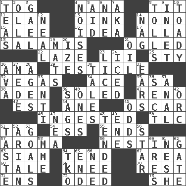 ACROSS 1. Coat; cloak 4. Grandmother 8. Teat (slang) 11. Enthusiasm 13. Pig sound 14. Words to Nanette 15. Toward shelter 16. It may be bright or harebrained 17. Silent film actress Nazimova 18. Deli grouping 21. Stared at amorously 22. Goldbrick 23. Cards in a Roman deck? 25. Filthy place 26. Wet nurse (var.) 29. A testis 32. Viva Las _ 34. Adept person 35. White ___ sheet 38. An important port of Yemen 39. Having a sole or soles 41. Former U.S. Attorney General Janet 43. Eastern Standard Time (abbr.) 44. One (Scot) 45. Motion picture award 46. Swallowed 50. Affectionate concern, for short 51. Label 54. Double-curved letter 55. Extremities 57. Scent 59. Nestling 63. Thailand, formerly 64. Be inclined (to) 67. Type of rug 68. Lie 69. Leg joint 70. Remainder 71. Followers of ems 72. Wrote a lyric poem 73. A female animal or person DOWN 1. Afternoon social gatherings 2. Spanish pot 3. Highlander 4. Annoying sounds 5. Assist 6. Compass dir. 7. Alias (abbr.) 8. For Whom the Bell _____ 9. An arm off of a larger body of water 10. Sycophant 12. Anneal 14. Tired old horse 19. Floor coverings 20. Ending with capital 21. Lubricate 23. Louse (plural) 24. On the rocks 26. Actress Gardner 27. Ancient Persian 28. Eras 30. Falsehoods 31. Hearing organs 33. Against 36. Religious group 37. Of or related to the anus 39. Settles 40. Washington bills 42. The grampus (Milton) 45. Likelihood 47. Teachers' org. 48. Watched over 49. Compass dir. 51. Clothes sense 52. Believer in; advocate of (suffix) 53. Finish lines 56. Play the lead 58. Madame (abbr.) 60. Angers 61. Delicate 62. Yard entry 64. Ring climax 65. Conclude 66. Born