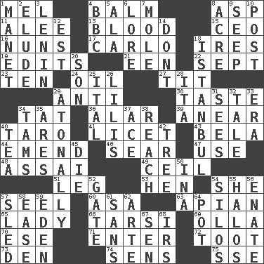 ACROSS 1. Cartoonist voice _ Blanc 4. Lip ointment 8. Cleo's killer 11. Toward shelter 13. Vital fluid 15. Corporate head (abbr.) 16. Religious women 17. Monte _, Las Vegas Hotel/Casino 18. Angers 19. Prepares for publication 21. Car or cant ending 22. Back-to-school mo. 23. "___ Little Indians" 24. Petroleum 27. Teat (slang) 29. Against 30. Clothes sense 34. Make lace 36. Having or resembling wings 39. Approach 40. Edible starchy tuberous root 41. It is permitted: Lat. 43. Actor Lugosi 44. Make improvements or corrections to 46. Dry up 47. Purpose 48. Slender Brazilian palm 49. To provide with a ceiling 51. Part of a journey 53. Layer 54. A female animal or person 57. Stitch closed the eyes of (a falcon) 60. White ___ sheet 63. Bee-related 65. Kenny Rogers chart-topper in '80 66. Tarsus (plural) 69. Rounded earthenware pot or jar 70. Compass dir. 71. Keyboard key 72. A blast of a horn 73. Lair 74. Elected reps. 75. Compass dir. DOWN 1. French painter Edouard 2. Dodge 3. Soviet premier 1918-24 4. English channel? 5. According to 6. Old wives' tales, e.g. 7. Undercover agent 8. Land measure 9. Ooze 10. Mail 12. Eastern Standard Time (abbr.) 14. Do not 18. Byzantium, centuries later 20. Boy, to dad 25. Slanted text style (abbr.) 26. Ms. Damita and namesakes 28. Call ___ day 29. Without tonality 31. Perceives with the eye 32. Falsehood 33. Epoch 34. Scottish caps 35. Ancient Greek god of war 37. Adept person 38. Arrive at 40. Beverage made from leaves 42. Relationship diagram 45. Expire 50. _ tizzy (2 wds.) 52. Yard entry 54. Grain storage towers 55. Saint headwear 56. Maternal 57. Downhill vehicle 58. Comfort 59. Genesis locale 61. Without 62. Johnson of "Laugh-In" 64. Cooking vessel 67. Elected rep. 68. Big collection agency