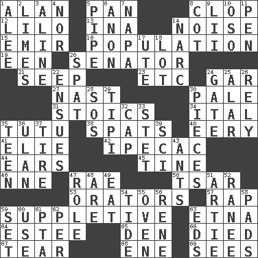 ACROSS 1. Actor Alda or Thicke 5. Baking dish 8. Hoof sound 12. _ and Stitch 13. _ tizzy (2 wds.) 14. Annoying sound 15. Independent ruler or chieftain 16. Census information 19. Car or cant ending 20. Legislator 21. Ooze 23. And so on (abbr.) 24. Slender fish 27. Political cartoonist Thomas 30. Light colored 31. Unemotional ones 34. Slanted text style (abbr.) 35. Ballerina skirt 38. Arguments over trivial matters 40. Suggestive of the supernatural 41. Writer Wiesel 42. Medicinal drug used to evoke vomiting 44. Hearing organs 45. Prong on a fork 46. Compass dir. 47. Actress Charlotte 50. Russian ruler of old 53. Speakers 57. Reproach for some lapse or misdeed 59. Supplementary 63. Inactive volcano in Sicily 64. First name in cosmetics 65. Lair 66. Passed on 67. Separate forcefully 68. Compass dir. 69. Observes DOWN 1. Toward shelter 2. Citrus fruits 3. Place in a line 4. And not 5. Corncob 6. Soon (poet.) 7. California wine valley 8. Small bed 9. Cards in a Roman deck? 10. Bear (Spanish) 11. Fenced enclosure 14. Drug cop 17. Shoshoni 18. Car dealer's back yard 20. Argument over a trivial matter 22. Follows as a consequence or result 24. Yard entry 25. Having or resembling wings 26. Have trust in 28. Distress signal 29. Native american tent (variation) 30. Components 32. Head covering 33. Proofreading order 35. Adolescent 36. Uhlan (variant) 37. Hoop that covers a wheel 39. _-fi 43. Pismires 47. Hero or heavy, e.g. 48. "We ___ not amused" (Victoria) 49. Consume 51. Nick name for Arthur 52. The wife of a rajah (variant) 54. Periodic rise and fall of the sea level 55. Baking chamber 56. French philosopher Descartes 58. Groovy apts. 59. Put into a specified state 60. Purpose 61. Parent Teacher Assoc. 62. For each 63. Begley and Asner