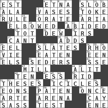 ACROSS 1. Eastern Standard Time (abbr.) 4. Inactive volcano in Sicily 8. Oscar Madison type 12. Insect wing 13. Flower holders 14. Casino tip 15. General guideline 17. Speak pompously 18. Roberta Peters solo 19. Turned at an angle; bent 21. Remained 23. Small child 24. Morning condensation 26. Big collection agency 27. Patter 28. Does sums 30. Snakelike fish 31. Chalkboards 34. 17th letter of the Greek alphabet 37. Compete 38. Consumed 39. Car or cant ending 40. Raised railways 41. Spring feasts 42. Compass dir. 43. Place where flour is made 44. Set down 46. Nine, plus one 47. Curvy letter 50. To free from 51. College papers 54. Winter's stalactites 57. Immeasurably long periods of time 58. Eucharist need 60. At one time in the past 62. Johnson of "Laugh-In" 63. Sports stadium 64. Island 65. Backtalk 66. Trial 67. Compass dir. DOWN 1. Hearing organ 2. Change direction abruptly 3. Baron Munchausen's specialties 4. Having ears or earlike features 5. Sadhe (variant) 6. Fish or hair follower 7. Toward the sea 8. Flight of steps 9. Nobles 10. Migrant worker of the '30s 11. Necklace unit 13. Solemn pledge 16. Inky black, to poets 20. Baseball player Mel 22. Auction offers 25. Wetness 27. To provide with a ceiling 29. Hiding places for outlaws 30. Night before a holiday 31. Stitch closed the eyes of (a falcon) 32. Dipping utensil 33. Had dinner 34. Dwelling 35. Command 36. Single 41. Trig term 43. Makes clutter 44. Curve 45. _ and Stitch 46. Portable shelters 48. Locates 49. Odor 51. Beverages made from leaves 52. Israeli folk dance 53. Argument over a trivial matter 55. _ tizzy (2 wds.) 56. Skim 59. "We ___ not amused" (Victoria) 61. Sight organ