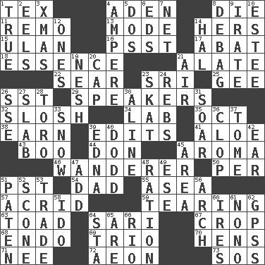 ACROSS 1. John Ritter's dad 4. An important port of Yemen 8. Expire 11. San ____ (Riviera town) 13. Method 14. Possessive pronoun 15. ____ Bator, Mongolia 16. Inconspicuous attention getter 17. Blind as ____ 18. Substance 21. Having winglike extensions 22. Shrivel 23. Indian title of respect (Mr.) 25. Unit of force equal to gravity 26. Fast jet (abbr.) 29. Orators 32. Splash clumsily 34. Experiment locale 35. Sep. follower 38. Merit 39. Prepares for publication 41. Medicinal plant 43. Surprise greeting 44. Spanish title 45. Scent 46. Nomad 50. For each 51. Pacific Standard Time (abbr.) 54. Male parent 55. At sea 57. Sour-tasting 59. Lacerating 63. Frog relative 64. Indian skirt 67. Riding implement 68. Inside; within (prefix) 69. Musical group of three 70. Coop moms 71. Born 72. Period of immesurable duration 73. Mayday DOWN 1. Loyal 2. Snakelike fish 3. Dec. holiday 4. Electrical Unit 5. Two (Sp.) 6. Begley and Asner 7. Remaining after all deductions 8. Debunk (Brit. slang) 9. Feeling or showing extreme anger 10. First name in cosmetics 12. Washington bills 14. Actor Linden 19. Soft 20. Head covering 21. Wind 23. Three-handed card game 24. Confederate soldiers (slang) 26. Compass dir. 27. Thick slice 28. "Corrida" creature 30. Place in a line 31. Fly high 33. Frozen precipitation 36. Hoof sound 37. Heavy book 39. Pulitzer Prize-winning author Ferber 40. Texas town _ City 42. Hearing organ 45. Type of rug 47. Find the sum of 48. Food allowance for one day 49. Compass dir. 51. Eucharist need 52. Biscuitlike quick bread 53. Exchange 56. Bowlike part 58. Wedding promise 60. Angers 61. Words to Nanette 62. Global Positioning Systems (abbr.) 64. R.R. building 65. "We ___ not amused" (Victoria) 66. _ de Janeiro