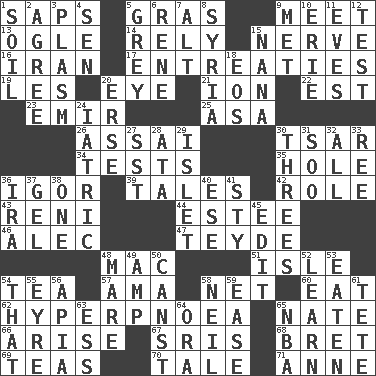 ACROSS 1. Plant excrements 5. Pate de foie ____ 9. Confront 13. Stare 14. Have trust in 15. Boldness 16. SW Asia republic 17. Pleas 19. French article 20. Sight organ 21. Electrically charged atom 22. Eastern Standard Time (abbr.) 23. Arab leader 25. White ___ sheet 26. Slender Brazilian palm 30. Russian ruler of old 34. Trials 35. Hollow 36. Russian composer Stravinsky 39. Stories 42. Hero or heavy, e.g. 43. Painter Guido (1575-1642) 44. First name in cosmetics 46. Actor Baldwin 47. Miss Universe 1986, Barbara Palacios _ 48. Big _ 51. Capri or Wight 54. Beverage made from leaves 57. Wet nurse (var.) 58. Fish or hair follower 60. Ingest 62. Abnormally rapid or deep breathing 65. Nathan's nickname 66. Get up 67. Indian titles of respect 68. Cy Young winner Saberhagen 69. Beverages made from leaves 70. Story 71. Queen of England 1702-14 DOWN 1. The visible part of the earth's surface 2. Match 3. Suffix with ecto or cyto 4. Elected rep. 5. Jennifer or Joel 6. French philosopher Descartes 7. The first octave above the treble staff 8. Damascus' land 9. Was introduced to 10. 4th largest of the Great Lakes 11. Nights before holidays 12. Trial 15. Grandmother 18. Greek goddess of the dawn 20. Celtic language 24. Of or pertaining to medicine 27. Fast jet (abbr.) 28. "One Day ___ Time" 29. Small island 30. Threesomes 31. "Barney Miller" actor Jack 32. 100% 33. Portuguese money of account (variant) 36. Retirement account (abbr.) 37. Set 38. Single 40. Compass dir. 41. Filthy place 45. Prepare for publication 48. Female horse 49. Electrical Unit 50. 2nd pers. sing. pres. of can (arch.) 52. Memorize 53. Eroded 54. Not this but _ 55. Jane of fiction 56. Capital of Western Samoa 58. Famous astronaut Armstrong 59. Comfort 61. False hair 63. Double-curved letter 64. Mouth or opening 65. Basketball assoc.
