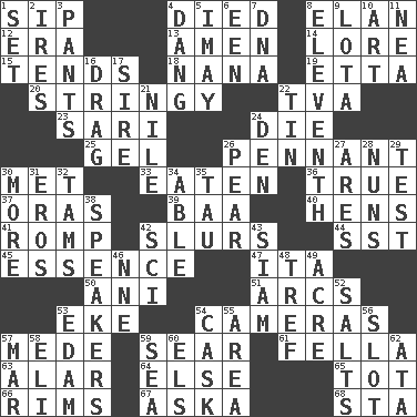 ACROSS 1. Small drink 4. Passed on 8. Flair 12. Epoch 13. So be it 14. Old wives' tales, e.g. 15. Watches over 18. Nanny 19. Singer James 20. Slender, wiry 22. Federal power corp. 23. Indian skirt 24. Expire 25. Set 26. Pre-World Series prize 30. Was introduced to 33. Ingested 36. Loyal 37. Mouths or openings 39. Sound made by sheep 40. Coop moms 41. Play 42. Plays smoothly or legato 44. Fast jet (abbr.) 45. Gist 47. Call ___ day 50. Cuckoo 51. Arches 53. Supplement with great effort 54. Devices for capturing images 57. Ancient Persian 59. Singe 61. Man or boy (slang) 63. Having or resembling wings 64. Otherwise 65. Small child 66. Basketball hoops 67. "____ silly question..." 68. R.R. building DOWN 1. Arrange properly for use 2. Angers 3. Leg coverings 4. Mild oath, euphamism for damn 5. "If ____ say so..." 6. Car or cant ending 7. Heredity factor (abbr.) 8. Veterans Day date 9. Globular water bottle used in Asia 10. Tate display 11. Teachers' org. 16. To trail on the ground 17. Title for a man of rank and authority 21. Mediterranean tributary 22. Shallow baking pan 24. Lair 26. Lightbulb-shaped fruit 27. Ancient Greek god of war 28. Religious women 29. Trial 30. Greater amount 31. Greek god of love 32. Scottish caps 34. Competent 35. The 19th letter of the Greek alphabet 38. Orators 42. _-fi 43. Thailand, formerly 46. Compass dir. 48. Not kosher 49. Land measure 52. Table seasonings 53. Dutch treat 54. Keg 55. Length times width 56. Notch 57. Make imperfect 58. Biblical high priest 59. Ocean 60. Raised railways 62. _ moment's notice (2 wds.)