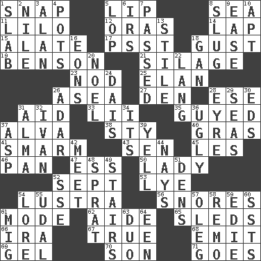 ACROSS 1. Fastener 5. Mouth edge 8. Ocean 11. _ and Stitch 12. Mouths or openings 14. Pet locale 15. Having winglike extensions 17. Inconspicuous attention getter 18. Abrupt rush of wind 19. Gillaume's butler role 21. Fodder prepared in a silo 23. Lower and raise head in agreement 25. Style 26. At sea 27. Lair 28. Compass dir. 31. Assist 33. Cards in a Roman deck? 35. Ridiculed 37. Inventor's middle name 38. Filthy place 40. Pate de foie ____ 41. Excessive but superficial compliments 43. Elected rep. 45. French article 46. Baking dish 47. Curvy letter 50. Kenny Rogers chart-topper in '80 52. Back-to-school mo. 53. Potassium hydroxide 54. A period of five years 56. Sounds asleep 61. Method 62. Assistant 65. Bobsleighs 66. Retirement account (abbr.) 67. Loyal 68. Send forth 69. Set 70. Manchild 71. Leaves DOWN 1. Broad, flat, thick piece 2. Mediterranean tributary 3. Actor Alda or Thicke 4. Cooking vessels 5. Trim (branches) 6. Big collection agency 7. Went by 8. Snaillike creature with no shell 9. Comfort 10. Fitting 13. Vertical member of a panel or frame 16. Immeasurably long periods of time 18. Separate the seeds from cotton 20. Christmas carol 22. Austrian-born American filmmaker Fritz 24. Raised platform 26. The sixth month of the Jewish calendar 28. Jane of fiction 29. Oceans 30. Begley and Asner 31. _ mater 32. _ the terrible 34. ___ a Wonderful Life 36. Repulsive 37. Viper 39. Shout 42. Confront 44. Negative votes 48. Small fatty European fish 49. Flight of steps 51. Lairs 52. Compass dir. 54. Old wives' tales, e.g. 55. Allodial 57. Cassini of fashion 58. San ____ (Riviera town) 59. Singer Brickell 60. Fast planes 61. Russian fighter aircraft 63. Superhero pair 64. Car or cant ending