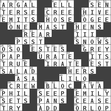 ACROSS 1. Therefore, facetiously 6. Pipe bend 9. Elected rep. 12. Laconic 13. Algonquian 14. Hub of activity 15. Gives off 16. Flexible conduit 17. Double curve, resembling the letter S 18. Single 19. Vertical spar for supporting sails 20. Coop moms 21. Tail end 23. One more than two 24. Inconspicuous attention getter 25. Frozen precipitation (plural) 28. Bear (Spanish) 30. _____ Park, CO 34. Jennifer or Joel 35. Infant food 36. A salt of uric acid 38. It is 39. Loyal 41. Feeling or showing extreme anger 43. Eastern Standard Time (abbr.) 44. First course 46. Possessive pronoun 48. White ___ sheet 49. _ and Stitch 50. Ship's personnel 51. Alliance 53. Actress Gardner 56. Silvers or Donahue 57. Ooze 58. Poet Dickinson 60. Puts into a specified state 61. Zero-star reviews 62. Desist 63. Attempt to accomplish something 64. Find the sum of 65. Lowest deck of a ship DOWN 1. Had dinner 2. San ____ (Riviera town) 3. Smile widely 4. Michaelmas daisies 5. French article 6. Greek god of love 7. For fear that 8. Area sheltered from the wind 9. Seigniories (variant) 10. Nights before holidays 11. Born 13. Burn to charcoal 14. Weeding 19. Taiwanese island in East China Sea 20. Part of HMS, perhaps 22. Compass dir. 24. Teen's desire 26. Moistens 27. System (abbr.) 28. Chooses 29. "Two Mules for Sister ____" 31. Three (prefix) 32. Ewer handle 33. R.R. building 37. Moral principle 40. Artist's stands 42. Snakelike fish 45. Fool 47. Nomad 49. Chops off 50. "Mermaids" star 51. Necklace unit 52. Grant temporary use of 54. Small bottle 55. In addition 56. Pacific Standard Time (abbr.) 57. Health resort 58. Environmental prefix 59. Slangy assent