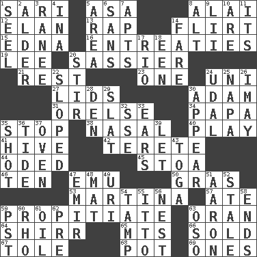 ACROSS 1. Indian skirt 5. White ___ sheet 8. Jai _ 12. Enthusiasm 13. Hit sharply and swiftly 14. Seductive woman who exploits men 15. Pulitzer Prize-winning author Ferber 16. Pleas 19. Area sheltered from the wind 20. More lively and spirited 21. Take ten 23. Single 24. Single; one (prefix) 27. Flaplike coverings 30. First man 31. Threatening words 34. Dad 35. Halt 38. Relating to the nose 40. Frolic 41. Hub of activity 42. Cigar-shaped 44. Wrote a lyric poem 45. Portico 46. Nine, plus one 47. Australian flightless bird 50. Pate de foie ____ 53. Chrissie's court nemesis 57. Had dinner 59. Conciliate 63. NW Algerian seaport 64. Bake eggs in their shells 65. Mountains (abbr.) 66. Disposed of to a purchaser 67. Lacquered or enameled metalware 68. Plant holder 69. Washington bills DOWN 1. Stitch closed the eyes of (a falcon) 2. Tree or shrub in the Birch family 3. Indian princess (variant) 4. _ tizzy (2 wds.) 5. Type of rug 6. Without 7. Flats, for short 8. Keyboard modifier key 9. Cards in a Roman deck? 10. "We ___ not amused" (Victoria) 11. It is 14. Conductor's collection 17. _ de Janeiro 18. Car or cant ending 20. Tumult 22. Slanted 24. Hereditary estate 25. California wine valley 26. "If ____ say so..." 28. Lair 29. Narrow board 30. Become visible 32. Compass dir. 33. Hearing organs 35. Went for two points 36. Event that recurs at intervals 37. Baking chamber 39. Allow 43. Ancient Roman robe 47. Arab leader 48. Floor protector 49. RI univ. 51. Composer Copland 52. Having lost freshness 54. Pack (down) 55. "Tell ____ the Marines!" 56. A home for chicks 58. Extremities 59. Pacific Standard Time (abbr.) 60. 17th letter of the Greek alphabet 61. Petroleum 62. Before (prefix) 63. Bear (Spanish)