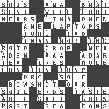 ACROSS 1. Indian titles of respect 5. Santa ___, CA 8. Naughty child 12. Emitted 13. Water source 15. Australian parrot (variant) 16. Puts on (as clothing) 18. Pale green bean 19. Sign of things to come 20. One (Scot) 22. Portable computers 24. "Corrida" creature 26. Small amount or degree 27. It was, poetically 28. Director Reiner 29. Indiana (abbr.) 32. Printing process, for short 35. Riding implement 37. Teachers' org. 38. Arabian gulf 39. Auto club (abbr.) 40. The sixth month of the Jewish calendar 41. Beverage made from leaves 42. Angers 43. Undercover agent 44. Begley and Asner 45. It is 46. Cook's measure (abbr.) 49. The grampus (Milton) 50. Flatfish 51. The distance a bow sends an arrow 55. Boat paddle 56. The visible part of the earth's surface 57. Greek god of love 59. Clothes sense 63. Competent 64. Table seasoning 65. Leaves 66. Inconspicuous attention getter 67. Ocean 68. Immeasurably long periods of time DOWN 1. Compass dir. 2. To sift 3. _ tizzy (2 wds.) 4. Ski resort town in Vermont 5. Leather borer 6. Famous astronaut Armstrong 7. _ mater 8. Vital fluid 9. Play 10. Ancient Greek god of war 11. Shallow baking pan 14. Portable computer 17. Overwhelm 21. Period 23. Keyboard key 25. Motion picture awards 28. Ridicules or criticizes harshly 29. _ china 30. Actress Patricia 31. Have the gumption 32. Pace 33. Wrote a lyric poem 34. Afternoon social gatherings 36. Actress Charlotte 40. Electrical Measurement 42. Irritating cutaneous sensations 45. Big collection agency 47. Surprise greeting 48. Narrow board 49. A small or young owl 51. Moves up and down 52. Petroleums 53. Mouths or openings 54. Lacquered or enameled metalware 56. Plant excrement 58. R.R. building 60. "Barney Miller" actor Jack 61. "___ Little Indians" 62. Double-curved letter