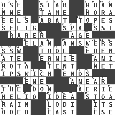 ACROSS 1. Order of Saint Francis (abbr.) 4. Broad, flat, thick piece 8. Wander aimlessly 12. Compass dir. 13. Docile 14. Israeli folk dance 15. Snakelike fish 17. Blind as ____ 18. Drinks excessively 19. Major League Baseball Commissioner Bud 21. Health resort 23. Fast jet (abbr.) 24. More uncommon 26. Mature 28. Enthusiasm 30. Statements in reply to questions 34. Compass dir. 37. Utensil 39. Paradise 40. Had dinner 41. Bert's buddy 43. Cuckoo 44. Roll call or roster of names 46. Portable shelter 47. Was introduced to 48. NE Massachusetts town 51. Extremities 54. Compass dir. 55. Approach 58. Definite Article 61. Spanish title 63. Nest on high 65. Sun: prefix 67. The content of cognition 71. Portico 72. Water falling in drops from the sky 73. Farming town in central California 74. It is 75. Wrote a lyric poem 76. Compass direction 77. Compass dir. DOWN 1. Singles 2. Contemptuous expression 3. Man or boy (slang) 4. R.R. building 5. Experiment locale 6. Housemaid (var.) 7. Antes 8. 17th letter of the Greek alphabet 9. I made a mistake 10. Ancient Greek god of war 11. Vertical spar for supporting sails 16. The founder of a family 18. Labels 20. Set 22. Baking dish 25. Assign a rank or rating to 27. She-sheep 29. Compass direction 30. Place in a line 31. Dutch treat 32. French philosopher Descartes 33. In a ____ (agitated or irritated) 34. Indian skirt 35. Halt 36. Soaks 38. Single 42. Inactive volcano in Sicily 45. Deep reverence 49. Southeast Asian peninsula 50. Corporate head (abbr.) 52. Heredity factor (abbr.) 53. Observes 56. Nick name for Arthur 57. Disturbances 58. Through, poetically 59. Froth on beer 60. Writer Wiesel 62. The longest river in the world 64. Relaxation 66. Working for oneself (abbr.) 68. ___ good deed 69. Begley and Asner 70. Small island