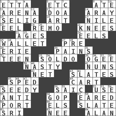 ACROSS 1. Singer James 5. And so on (abbr.) 8. Had dinner 11. Sports stadium 13. ___ good deed 14. Like ___ of sunshine 15. Major League Baseball Commissioner Bud 16. Nonscientific branch of learning 17. "Death on the ____" 18. Snakelike fish 19. San ____ (Riviera town) 21. Leg joints 22. Ripens 24. Snakelike fish 25. Place for singles 27. Before (prefix) 29. One of the Great Lakes 30. Aches 32. Adolescent 33. Twentieth part of a lira 35. Double curve, resembling the letter S 39. Smutty 41. Religious women 42. Remaining after all deductions 43. Chalkboards 45. Hurried 48. Haul 49. Shabby and untidy 50. Ketch in the Levant 52. Purpose 55. Opposed to 56. Republican Party 57. Having ears or earlike features 59. Sweet dark-red dessert wine 60. Raised railways 61. Chalkboard 62. Indian title of respect (Mr.) 63. Born 64. Actor Alda or Thicke DOWN 1. Relaxation 2. Woody plant 3. Copy Pinocchio 4. Cuckoo 5. Dutch treat 6. "Corrida" creature 7. Domesticated feline 8. Satellite of Uranus 9. Stories 10. Sight organs 12. Match 14. Queen of England 1702-14 20. Eastern Standard Time (abbr.) 21. Peachy ____! 23. American astronaut and politician John 25. Dripping 26. "We ___ not amused" (Victoria) 27. Groovy apt. 28. River (Sp.) 30. Travel a route regularly 31. Underwater navigation system 33. Compass dir. 34. Baseball player Mel 36. From the throat 37. Compass dir. 38. Curvy letter 40. Actor Griffith 43. _-fi 44. Shoestrings 45. Sir (Sp.) 46. _ dish (used to culture cells) 47. Prepare for publication 49. Plant excrements 50. Not divided or shared with others 51. Domed church section 53. Stalk of a moss capsule 54. Paradise 56. Commissioned mil. rank 58. Insect wing