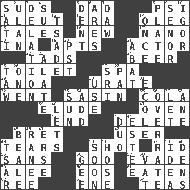 ACROSS 1. Beer foam 5. June honoree 8. 23rd letter of the Greek alphabet 11. Native American of Southwest Alaska 13. Epoch 14. Cassini of fashion 15. Falsehoods 16. ___ Haven, CT 17. Billionth: prefix 18. _ tizzy (2 wds.) 19. Tenement units (abbr.) 21. Thespian 22. Bits 24. Fermented drink made from hops 25. Bathroom plumbing fixture 27. Health resort 29. Small Philippine buffalo 30. A salt of uric acid 32. Left 33. Indian antelope 35. Root beer relative 39. Dodge 41. Baking chamber 42. Conclude 43. Keyboard key 45. Cy Young winner Saberhagen 48. One who uses or employs something 49. Lacerates 50. Went for two points 52. To free from 55. Without 56. Thick or sticky substance 57. Elude 59. Toward shelter 60. Greek goddess of the dawn 61. Ingested 62. To sift 63. Compass dir. 64. Afternoon social gatherings DOWN 1. Suttee (variant) 2. ____ Bator, Mongolia 3. Accusation by an informer 4. Institute legal proceedings 5. Gouge 6. Ancient Greek god of war 7. Fool 8. Food holder 9. Sir (Sp.) 10. Russian composer Stravinsky 12. Sadhe (variant) 14. Single time 20. Pacific Standard Time (abbr.) 21. Blind as ____ 23. Having winglike extensions 25. The 23rd letter of the Hebrew alphabet 26. Single 27. _ Lanka 28. Baking dish 30. Purpose 31. Learning spot: Fr. 33. Player for Phoenix 34. Find the sum of 36. Make much ado about nothing 37. Allow 38. One (Scot) 40. Allows 43. Superhero pair 44. First name in cosmetics 45. Calif. Air Force Base 46. The wife of a rajah (variant) 47. Celtic language 49. Russian ruler of old 50. Within a short period 51. Flexible conduit 53. It may be bright or harebrained 54. Lairs 56. Turn to the right 58. Large container