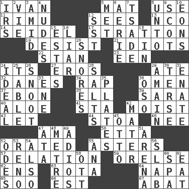 ACROSS 1. "Terrible" tsar 5. Floor covering 8. Purpose 11. Tall New Zealand timber tree 12. Perceives with the eye 13. Non-commissioned officer (abbr.) 14. Beer mug 17. Ski resort town in Vermont 19. Cease 21. Foolish or stupid persons 22. Comedian Laurel of Laurel & Hardy 23. Car or cant ending 24. ___ a Wonderful Life 27. Greek god of love 29. Had dinner 32. Natives or inhabitants of Denmark 34. Reproach for some lapse or misdeed 36. Sign of things to come 37. Inky black, to poets 38. Pipe bend 39. "Two Mules for Sister ____" 40. Medicinal plant 41. R.R. building 42. Wet 43. Allow 44. Portico 46. Born 47. Wet nurse (var.) 50. Singer James 52. Spoke pompously 55. Michaelmas daisies 57. Accusation by an informer 59. Threatening words 62. Followers of ems 63. Round or rotation of duties 64. California wine valley 65. "Barney Miller" actor Jack 66. Eastern Standard Time (abbr.) 67. Blind as ____ DOWN 1. Big collection agency 2. Compete 3. Among 4. Unclothed pictures 5. Was introduced to 6. Nest on high 7. Sadhe (variant) 8. To (old English) 9. Native of Scotland 10. Immeasurably long periods of time 12. Fast jet (abbr.) 15. _____ Park, CO 16. One who doesn't tell the truth 18. Shallow baking pan 20. Sounds asleep 24. Perfect 25. Eating place 26. Snob 28. Table seasonings 29. With great haste 30. Laconic 31. Maternal 33. Compass dir. 35. Food holders 36. Bear (Spanish) 42. Mother 45. Von Bismarck 47. _ moment's notice (2 wds.) 48. Distance measurement (Brit.) 49. Goodbye (Sp.) 51. Sports stadium 52. Lyric poems 53. Former U.S. Attorney General Janet 54. In addition 55. Santa ___, CA 56. Thick slice 58. Baseball player Mel 60. Health resort 61. Consume