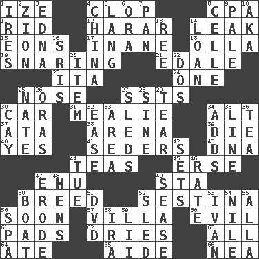 ACROSS 1. Ending with capital 4. Hoof sound 8. Numbers guy (abbr.) 11. To free from 12. Ethiopian city, capital of Harari 14. Path through which fluid escapes 15. Immeasurably long periods of time 17. Empty; void 18. Rounded earthenware pot or jar 19. Catching in a trap 21. Peak District village in England 23. Call ___ day 24. Single 25. Characteristic smell of wine 27. Fast planes 30. Automobile 31. Ear of corn 34. The first octave above the treble staff 37. "One Day ___ Time" 38. Sports stadium 39. Expire 40. Affirmative reply 41. Spring feasts 43. Heredity factor (abbr.) 44. Afternoon social gatherings 45. Celtic language 47. Australian flightless bird 49. R.R. building 50. A special lineage 52. French poetic form 56. Within a short period 57. Country residence 60. Morally bad or wrong 61. Writing tablets 62. Frees from moisture 63. Everything 64. Had dinner 65. Assistant 66. Teachers' org. DOWN 1. Angers 2. The Jewish people; Israel 3. Pulitzer Prize-winning author Ferber 4. Large country 5. Long (Scottish) 6. Mouth or opening 7. Baking dish 8. Cell (Danish) 9. Diluted with white 10. Alias (abbr.) 13. To separate or throw off 14. Grant temporary use of 16. Indian titles of respect 20. A whole individual unit 22. Two (Sp.) 25. Nathan's nickname 26. Mouths or openings 27. Bobsleighs 28. Trig term 29. Lacerate 30. Island 32. Relaxation 33. Type of rug 34. Does sums 35. Actor's bit 36. Beverage made from leaves 42. Arranges properly for use 44. Third day of the wk. 46. Assign a rank or rating to 47. Wear away 48. Not women's 49. Gospel singer Marvin 50. Water vessel 51. Movie disc 52. Downhill vehicle 53. "Terrible" tsar 54. Mediterranean tributary 55. Silent film actress Nazimova 56. Health resort 58. Retirement account (abbr.) 59. Cards in a Roman deck?
