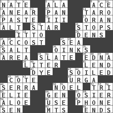 ACROSS 1. Nathan's nickname 5. Chicken ___ king 8. Adept person 11. Approach 13. Baking dish 14. Edible starchy tuberous root 15. Thick mixture 16. One more than two 17. NW Algerian seaport 18. The first octave above the treble staff 19. Play the lead 21. Ceases 22. "Tell ____ the Marines!" 24. Hiding places for outlaws 25. Buttonhole 27. Ocean 29. Table seasoning 30. Pig sounds 32. Type of rug 33. Chalkboard 35. Pulitzer Prize-winning author Ferber 39. 61 cubic inches 41. Grant temporary use of 42. Color 43. Dirtied 45. ____ d'Azur (French Riviera) 48. Capital and largest city of Mongolia 49. Spanish missionary in California 50. Christmas carol 52. Three (prefix) 55. Writer Wiesel 56. Commissioned mil. rank 57. Flexible twig of a willow tree 59. _ vera 60. Purpose 61. Give a jingle 62. Elected rep. 63. Mountains (abbr.) 64. Extremities DOWN 1. California wine valley 2. Of or related to the anus 3. A testis 4. Ingest 5. Capital of Western Samoa 6. Den 7. Black tropical American cuckoo 8. Composer Copland 9. Dice game 10. Immeasurably long periods of time 12. Musical pauses 14. Lug 20. Small child 21. Neighbor of Neb. 23. Add up to 25. White ___ sheet 26. 4-wheeled motor vehicle 27. Be seated 28. Compass dir. 30. Boat paddle 31. Former Milwaukee Brewers owner Bud 33. Filthy place 34. Area sheltered from the wind 36. Accusation by an informer 37. Compass dir. 38. Increase 40. The content of cognition 43. Institute legal proceedings 44. Lowest deck of a ship 45. Cell (Danish) 46. Greek mythologigal hunter 47. Family _ (genealogy) 49. Oceans 50. Egg locale 51. Washington bills 53. Tear apart 54. Angers 56. Chewing product 58. A female animal or person
