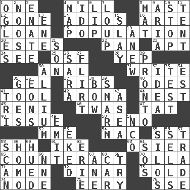 ACROSS 1. Single 4. Place where flour is made 8. Vertical spar for supporting sails 12. Went 14. Goodbye (Sp.) 16. Johnson of "Laugh-In" 17. Grant temporary use of 18. Census information 20. _____ Park, CO 22. Baking dish 23. Fitting 24. Perceive with the eye 25. Order of Saint Francis (abbr.) 28. Slangy assent 30. Of or related to the anus 31. Compose 35. Set 37. Chest bones 40. Lyric poems 41. Implement 42. Scent 44. A home for chicks 45. Painter Guido (1575-1642) 46. It was, poetically 47. Make lace 48. Come out of 50. Western Nevada city 52. Madame (abbr.) 54. Apple computer (short form) 55. Fast jet (abbr.) 58. Quiet! 61. Mamie's husband 63. Flexible twig of a willow tree 65. Neutralize 70. Spanish pot 71. So be it 72. Middle Eastern gold or silver currency 73. Exchanged or delivered for money 74. Connecting point 75. Suggestive of the supernatural 76. Compass dir. DOWN 1. Stares at amorously 2. Trap for birds or small mammals 3. Related on the mother's side 4. Atlas unit 5. Wedding promise 6. Mouth edge 7. Central Nebraska county 8. Floor covering 9. Roberta Peters solo 10. Constrict 11. Portable shelter 13. Compass dir. 15. Kill 19. Afresh 21. Manchild 26. "Two Mules for Sister ____" 27. Seductive woman who exploits men 29. Right away 30. Plant genus of onion and garlic 32. The main thing one is thinking about 33. Trial 34. Eastern Standard Time (abbr.) 35. Leaves 36. Immeasurably long periods of time 38. Ribbon knot 39. Excessive but superficial compliments 41. Three (prefix) 43. At sea 49. Send forth 51. Non-commissioned officer (abbr.) 53. Made supply last 55. Grain storage towers 56. Exchanges for money 57. Swap 58. Glance over 59. Like (prefix) 60. Became colored 62. 4th largest of the Great Lakes 64. Mayday 66. Compass dir. 67. One (Scot) 68. Auto 69. Attempt to accomplish something